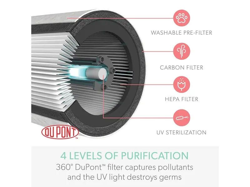 Поставете дистанционния SensorPod далеч от пречиствателя на въздуха, за да оптимизирате подаването на чист въздух в цялото ви пространство. Той автоматично настройва скоростта на вентилатора в отговор на показанията на качеството на въздуха на SensorPod. Цветно осветеният му пръстен и цифровата стойност съобщават за добро, умерено или лошо качество на въздуха. 360º филтър DuPont HEPA улавя замърсители, VOC газове и миризми от всички посоки,а UV светлината убива микробите и бактериите, които могат да попаднат във филтъра.