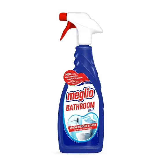 Препарат за баня Meglio 650 мл спрей е супер ефективен спрей за баня, който почиства до блясък фаянс, керамика, душове и други повърхности. Осигурява дълбоко почистване и е мощен срещу замърсявания и варовик.