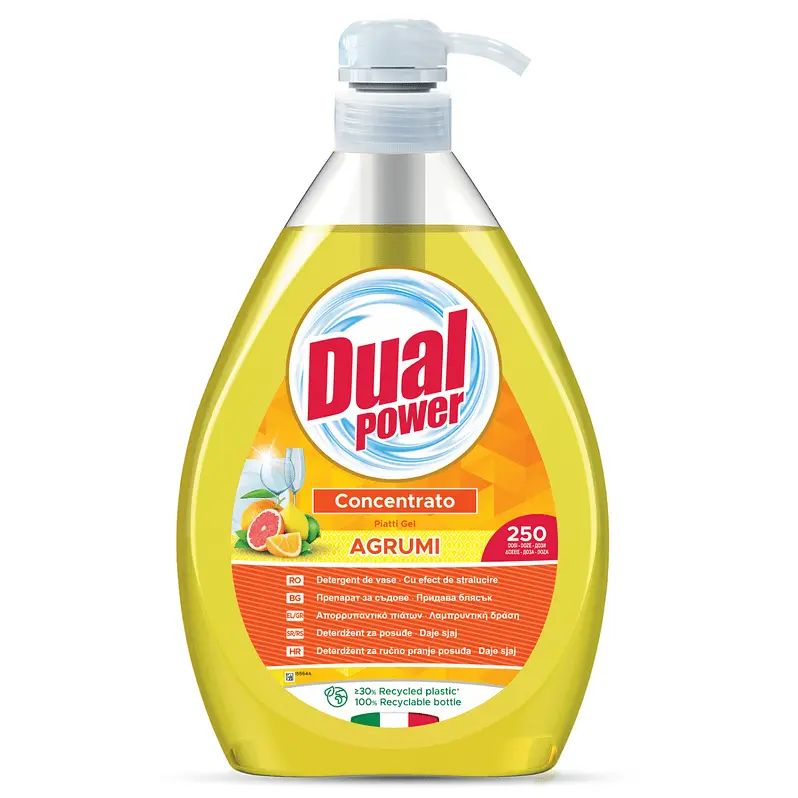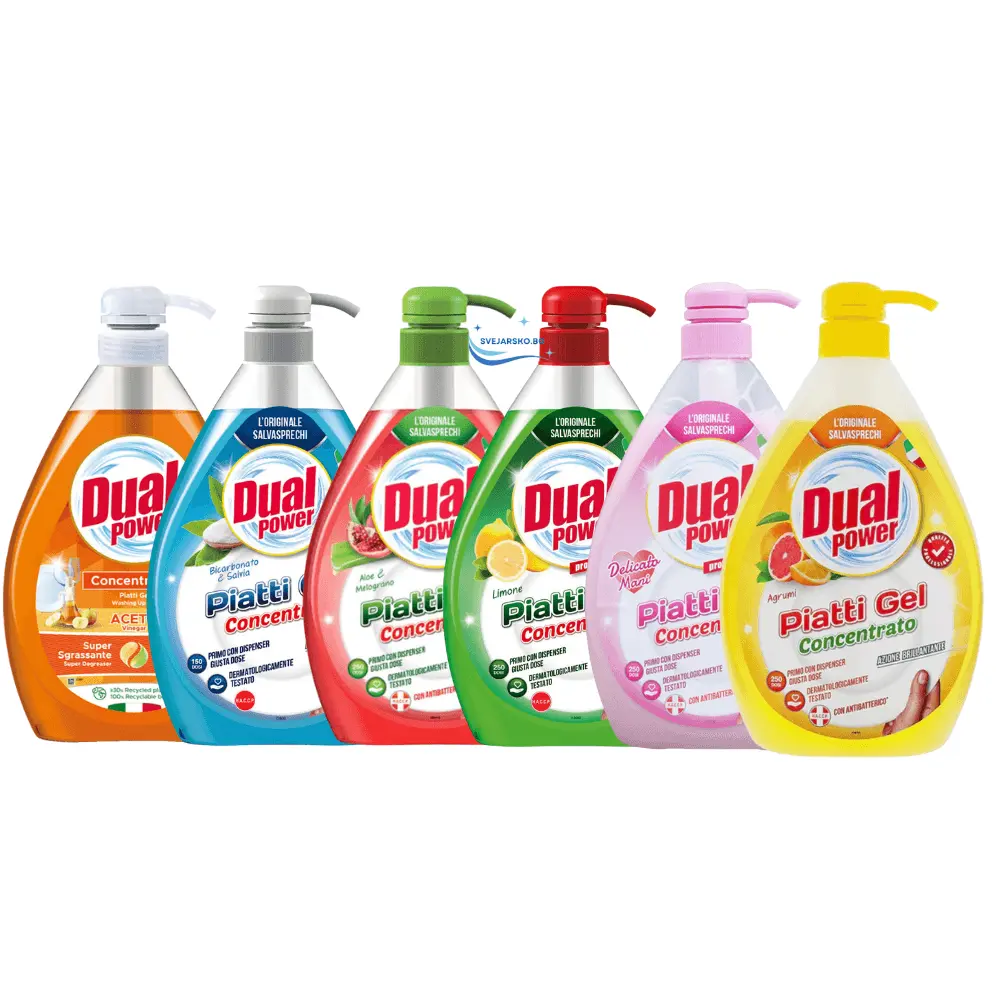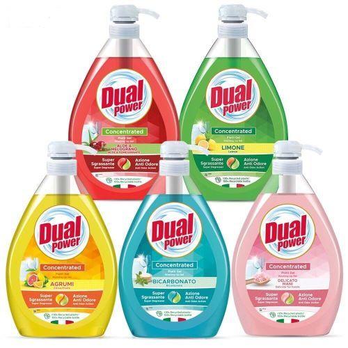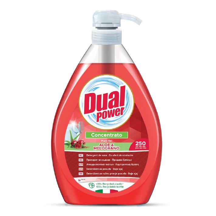 Dual power 1 л е с концентрирана гел формула, която лесно отстранява мръсотията по домакинските съдове и прибори за хранене. Помпата на бутилката спомага за премерена дозировка. Препаратът поддържа около 250 измивания. С новата си формул DUAL POWER елиминира мазнините и миризмите и оставя изключително чист и свеж аромат. Продуктът е дерматологично тестван, а също така притежава антибактериално действие.