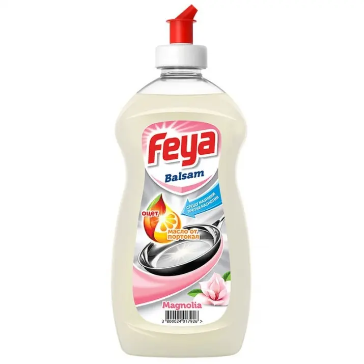 Feya 400мл е препарат за измиване на съдове, които отлично почистват упоритите мазнини дори и със студена вода. Формулата му е обогатена с балсам, който се грижи за деликатната кожа на ръцете и предпазва от изсушаване. Продуктът отстранява замърсяванията само с едно минаване с гъбата и оставя огледален блясък.
