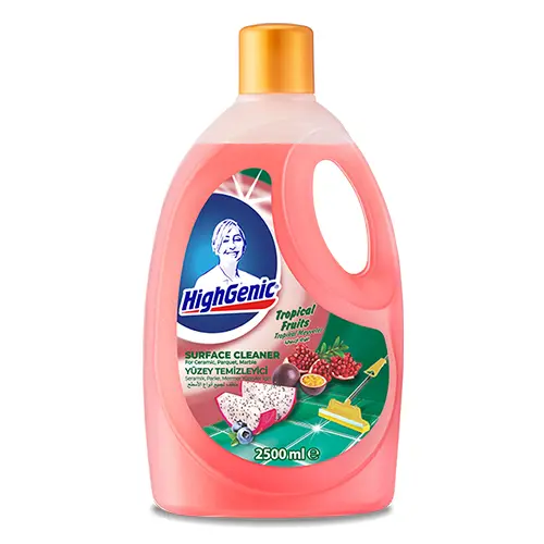 Препаратът HighGenic Tropical fruits 2.5 л е предназначен за почистване на различни видове настилки и повърхности, като успешно се бори с миризми и зацапвания. Продуктът осигурява ефективно почистване на големи площи като подове, повърхности от мозайка, теракота, стени, фаянс и други. HighGenic не оставя следи, премахва неприятните миризми и има свеж приятен аромат на тропически плодове.