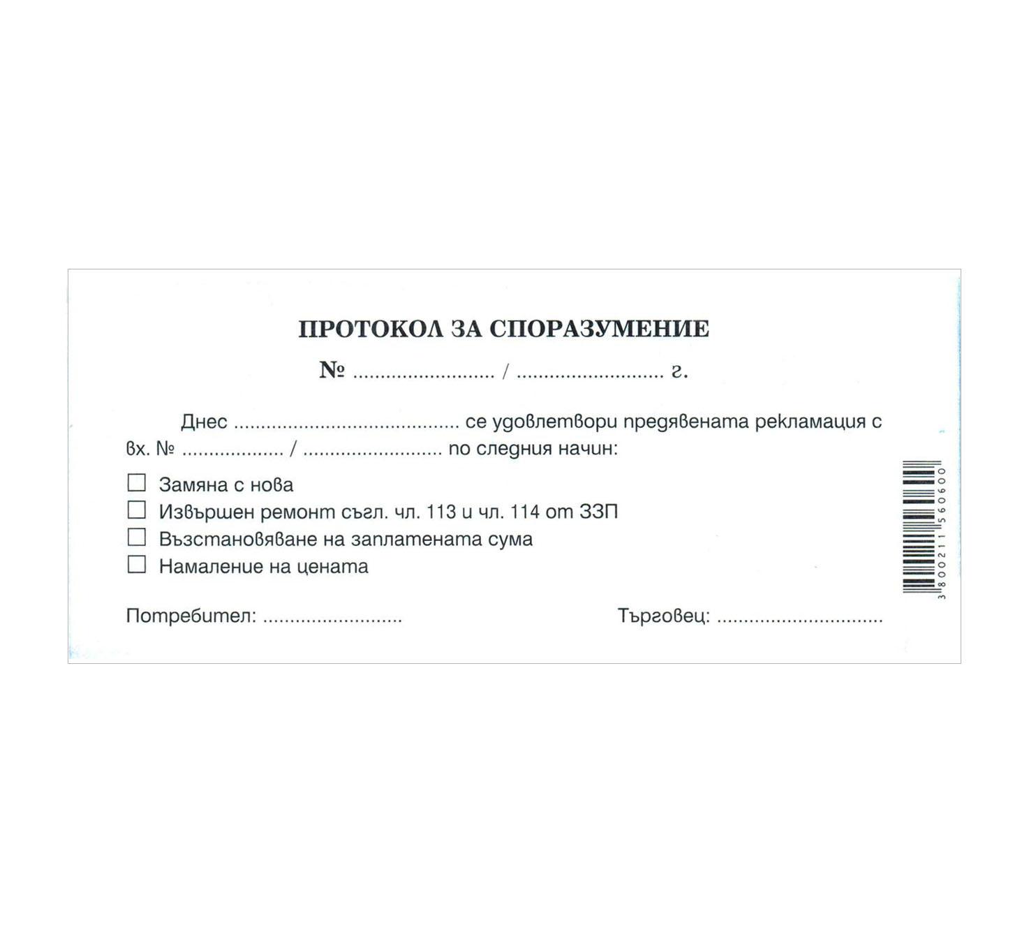 Протокол за споразумение за уточняване решението по рекламацията – връщане на парите, извършване на ремонт, замяна с нов артикул или намаление на цената. Необходим при предявяване на рекламация.