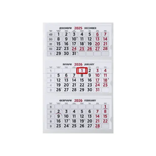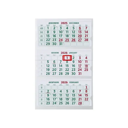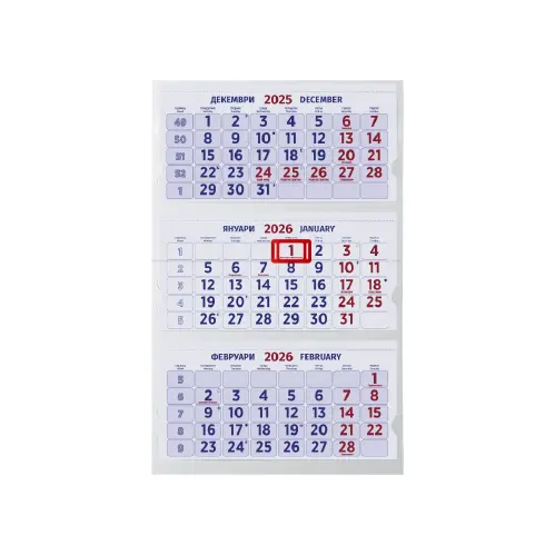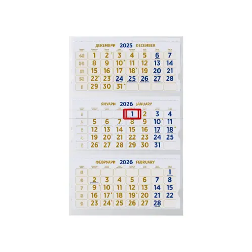 Функционален работен календар с три тела без рекламна глава, с изчистен и професионален вид. Оборудван с подвижно прозорче за отбелязване на текущата дата, което улеснява ежедневната ориентация.