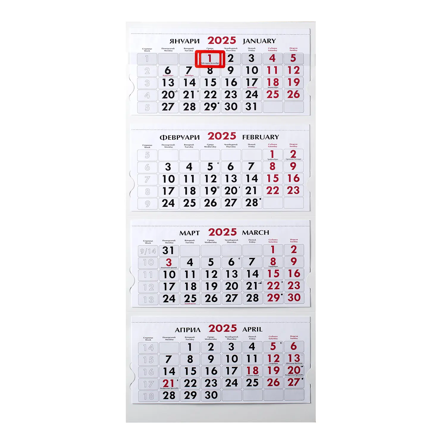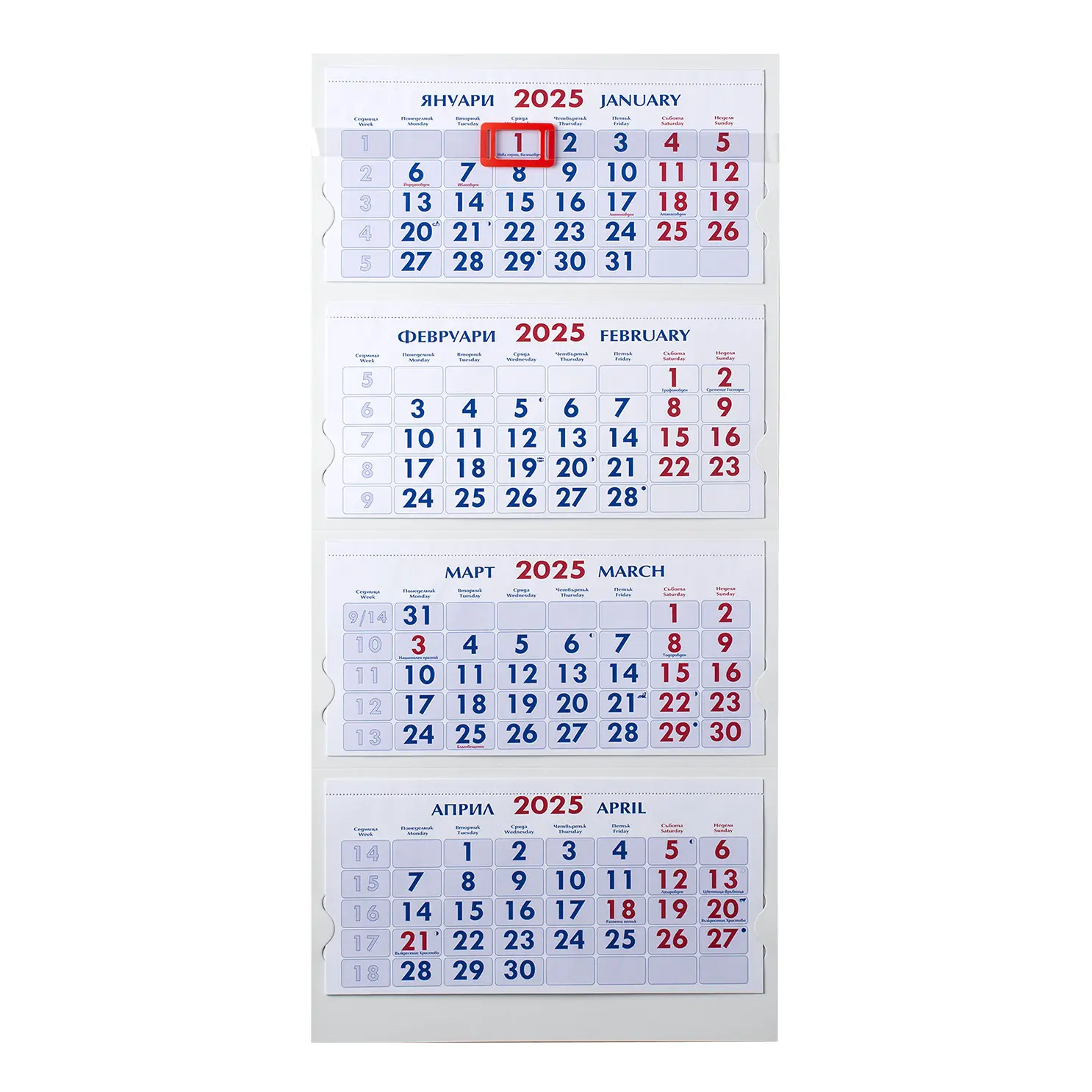 Практичен и функционален работен календар с четири тела, представящ предходен, текущ и два следващи месеца за по-добро планиране. Изчистеният дизайн без глава го прави подходящ за всякаква работна или домашна среда. Прозорчето за отбелязване на текущата дата улеснява ориентирането във времето.