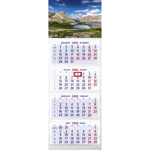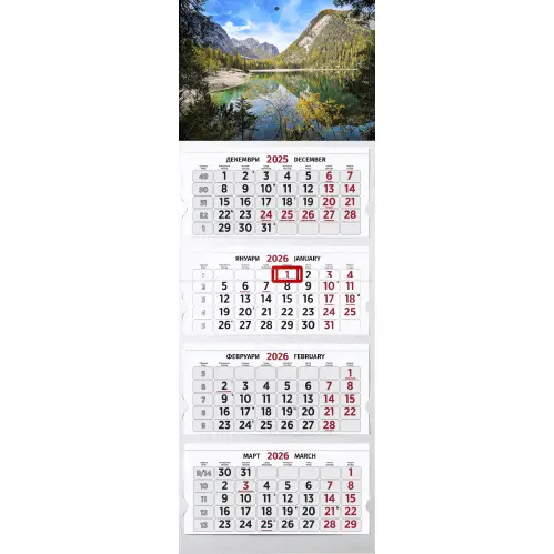Практичен и стилен работен календар с четири тела и готова цветна глава с красиви природни пейзажи. Класическият му дизайн го прави подходящ за офис, работно помещение или дом.