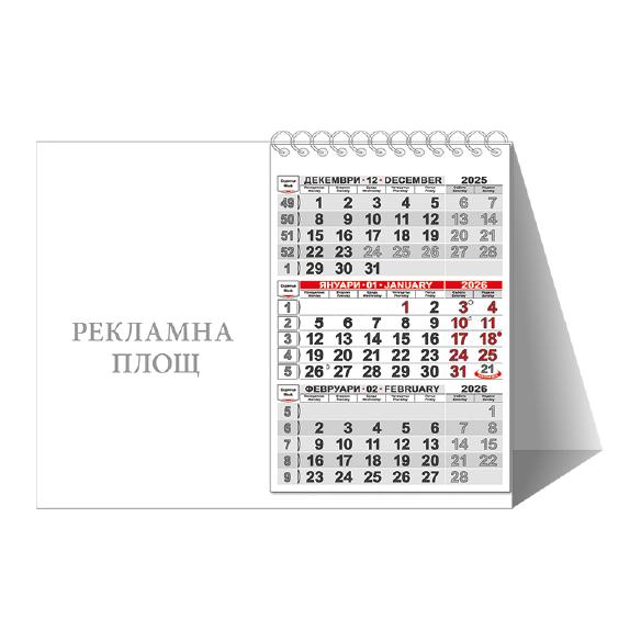 Работен календар пирамидка КП 2 е практичен и елегантен настолен календар, подходящ за всеки офис или работна среда. Тялото съдържа три календариума с ясно обозначени официални празници и лунни фази, което осигурява удобство при планиране на работните дни.