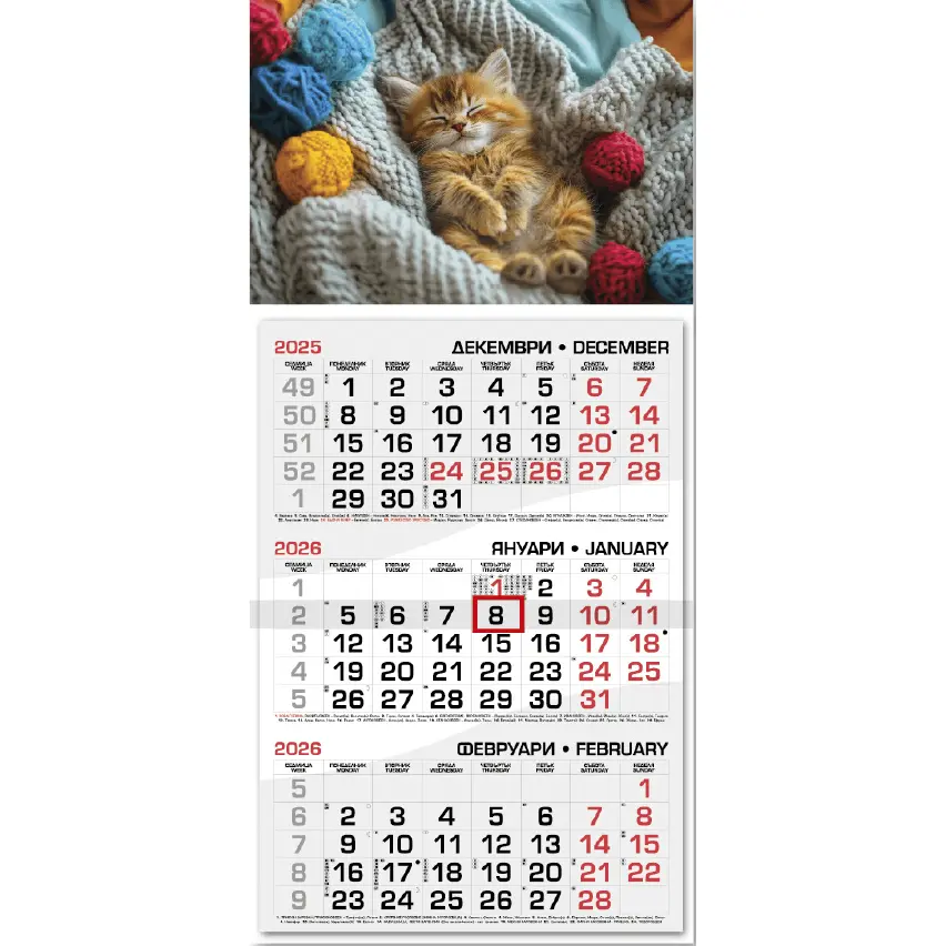 Работен календар РК 101 готова глава е стилен и функционален стенен календар, който предлага удобство и яснота през цялата година. Той е подходящ за офиси, бизнес среди и дома, като съчетава практичност и елегантен външен вид.