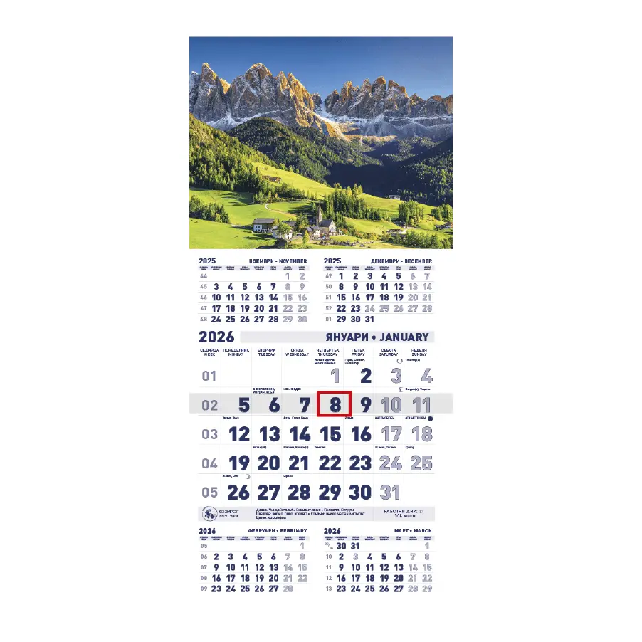 Работен календар РК Марина с готов дизайн е елегантен и практичен стенен календар, създаден за удобство и стил през цялата година. Календарът разполага с календариум на два езика – български и английски, което го прави подходящ както за лична употреба, така и за корпоративна среда.