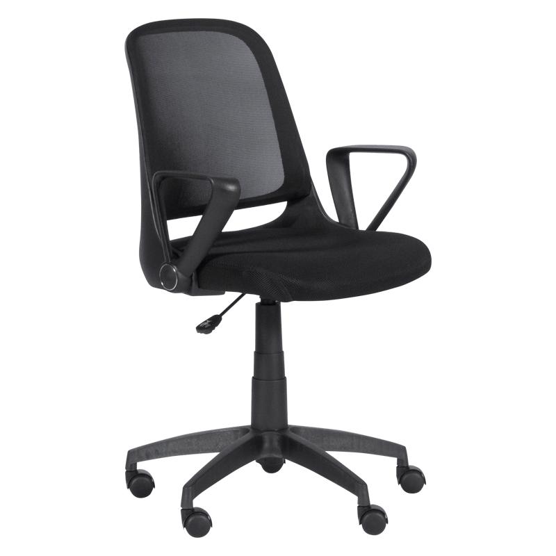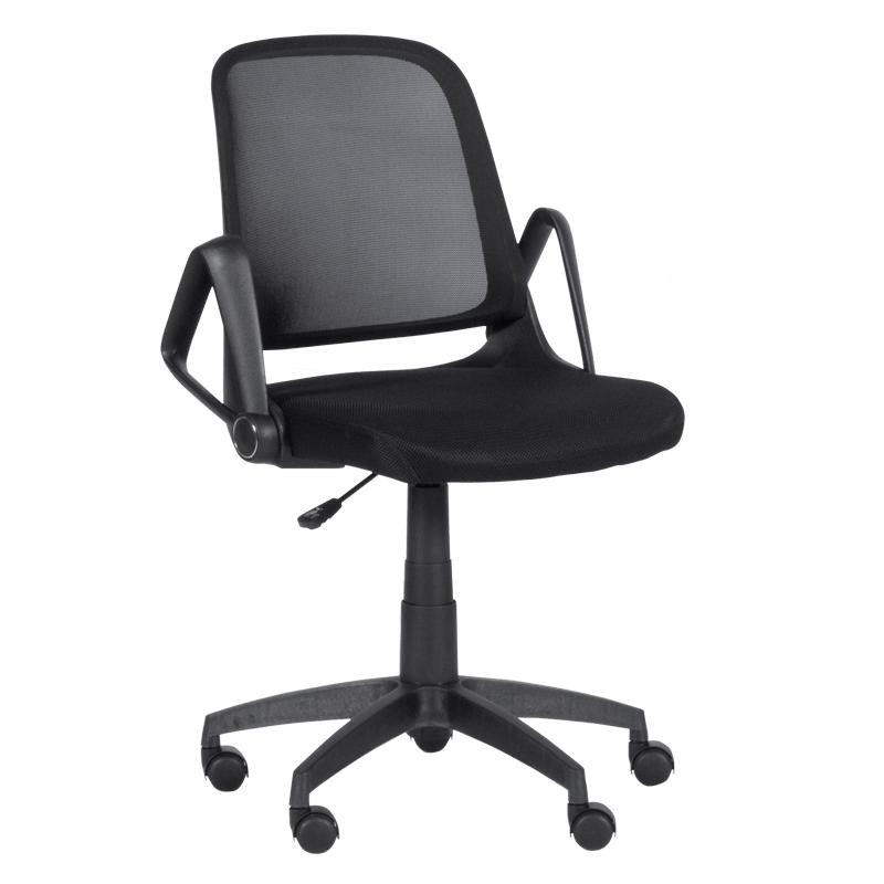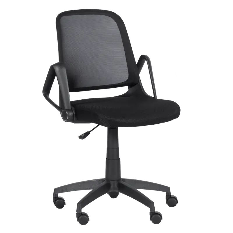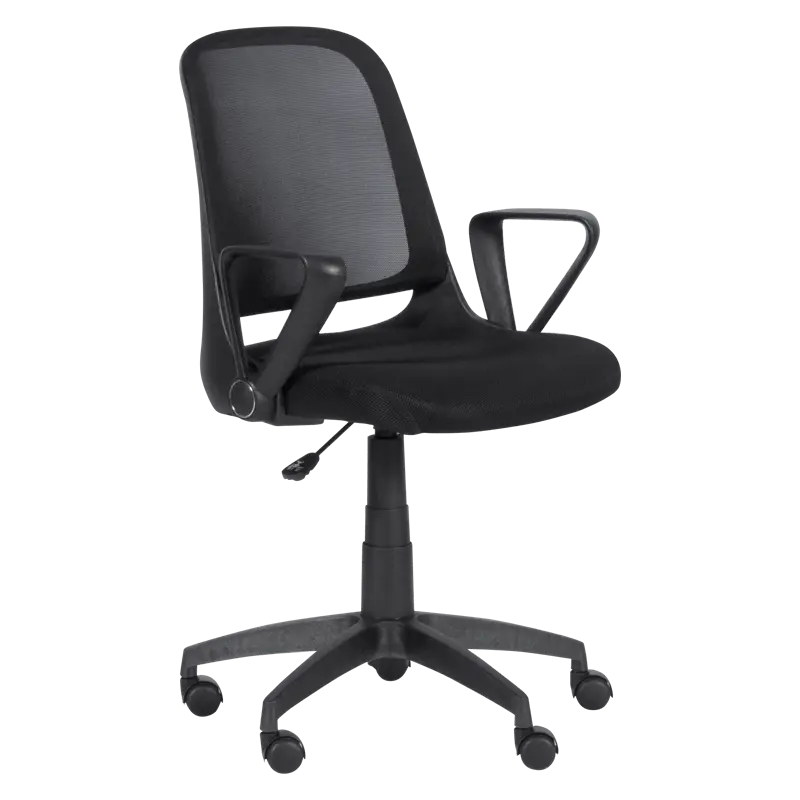 Работен стол ДЕА е практичен и удобен модел с прибиращи се подлакътници и механизъм за регулиране на височината. Столът е изработен от здрава текстилна мрежа и полипропилен в черен цвят.
