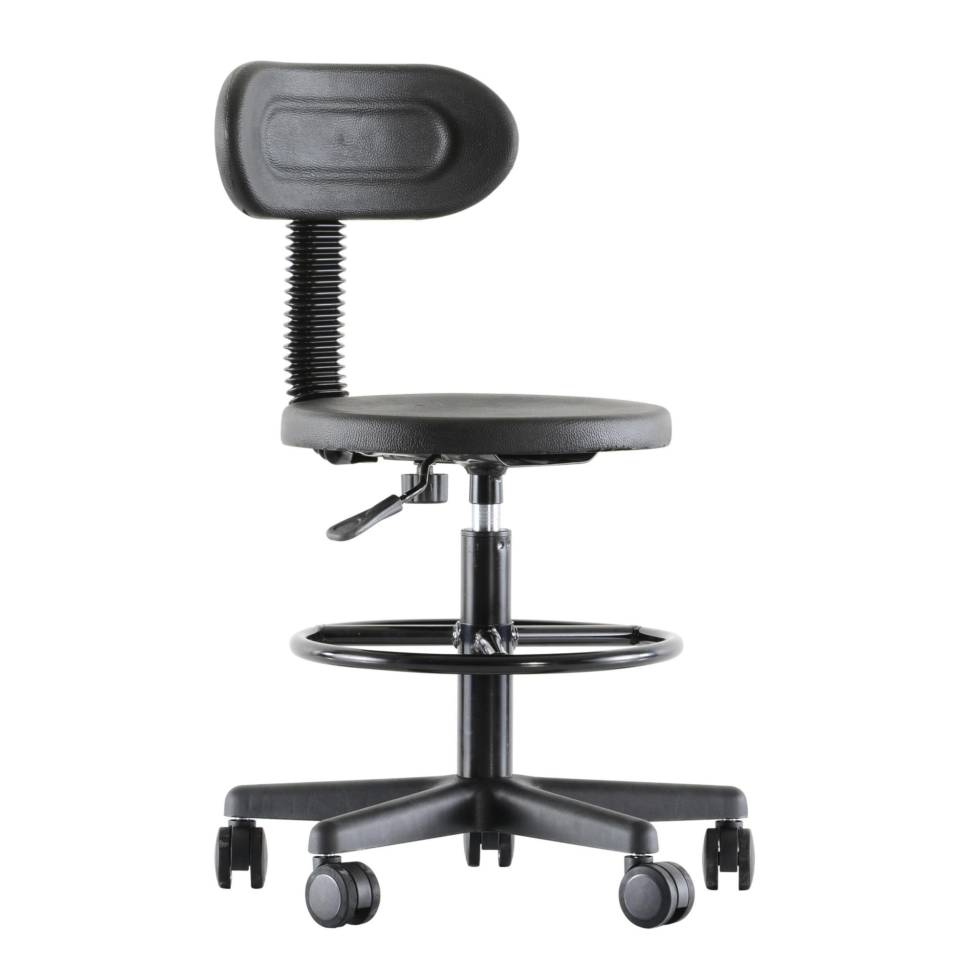 Работния стол МЕГА PU е висок работен стол с колелца. Удобна седалка и облегалка от полипропилен, с възможност за лесна подръжка. Без подлакътници за лесно движение на ръцете.
