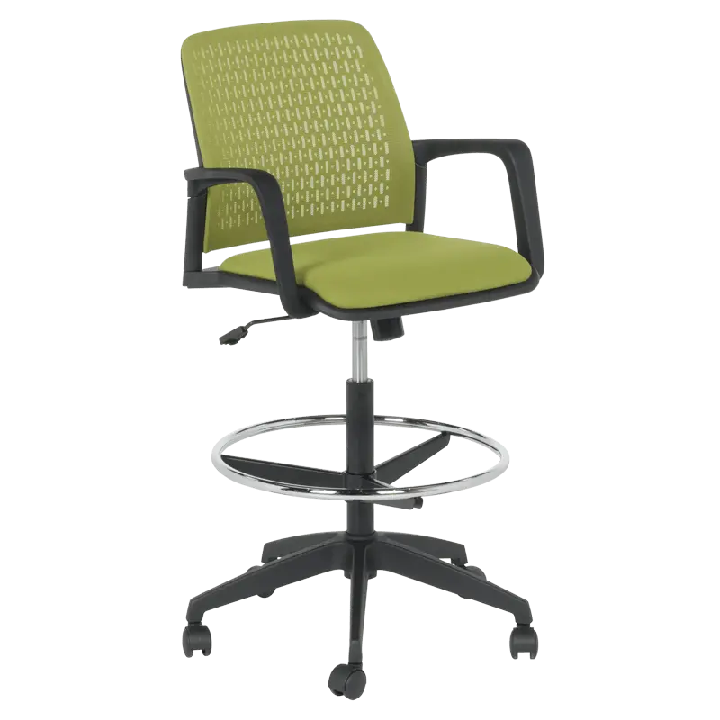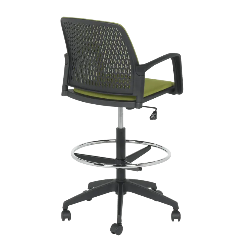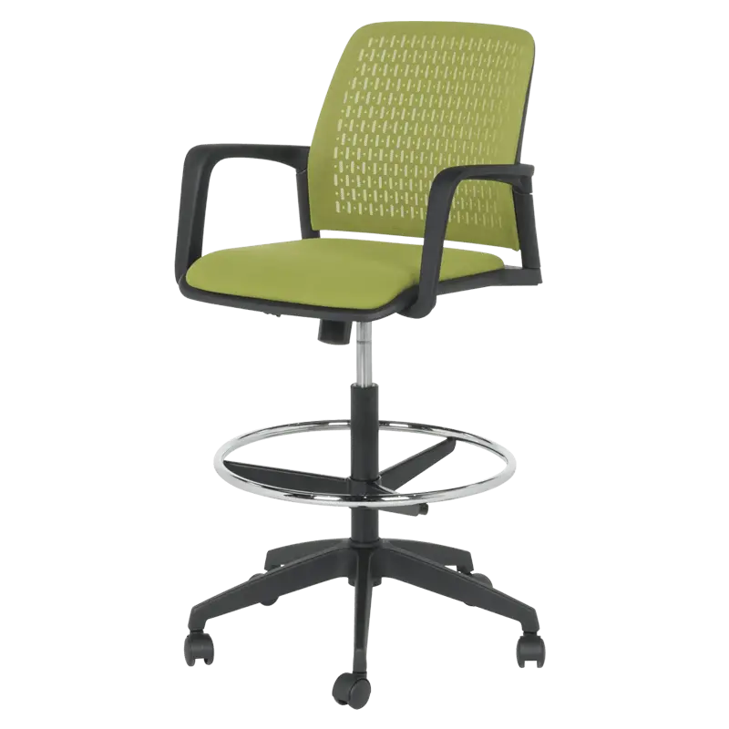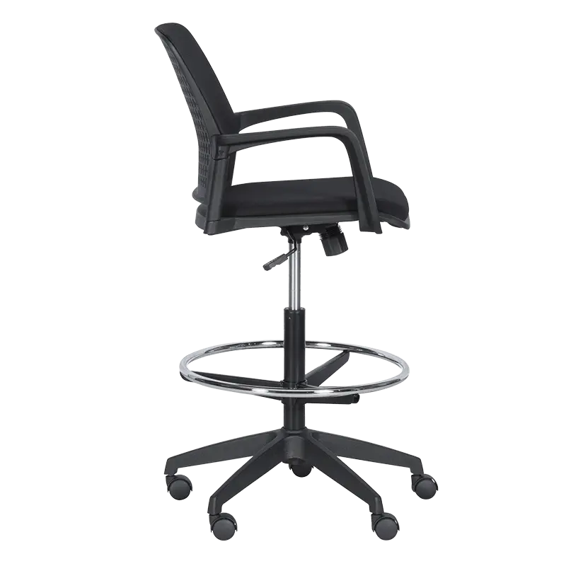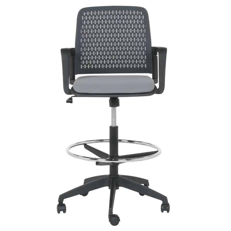 Работен стол ТРЕНДО комбинира функционалност и комфорт. Благодарение на регулируемата си височина и хромирана степенка тип ринг, той може да се използва както като обикновен офис стол, така и като висок работен стол. Степенката осигурява удобна опора за краката и предпазва от неприятното усещане за „висящи“ крака при по-висока позиция на седалката. Седалката е тапицирана с дамаска, а облегалката е изработена от полипропилен с мрежеста структура за по-добра вентилация и циркулация на въздуха.