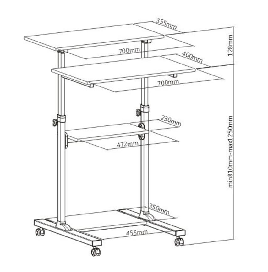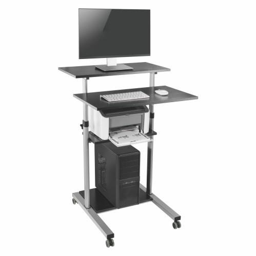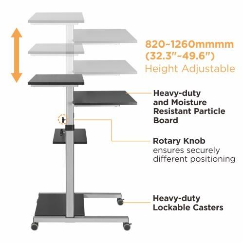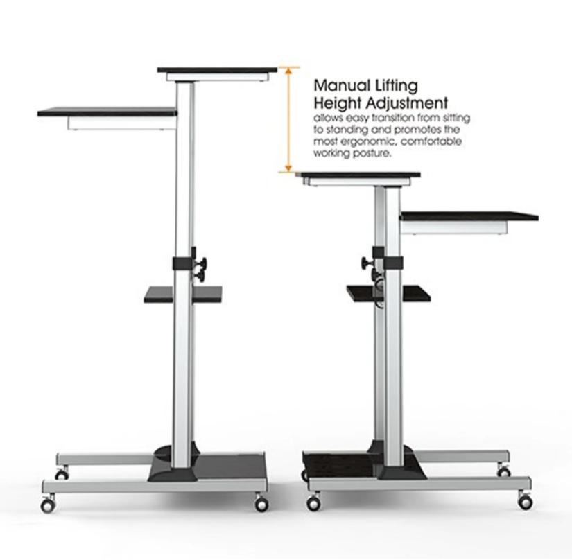 Работната маса е чудесен начин за подобряване на работния процес в офиса и дава възможност за работа в изправено състояние, като по този начин предотвратява схващания, причинени от продължително седене. Плотовете на масата са изработени от ПДЧ с водоустойчиво меламиново покритие и са с дебелина 16мм и максимално допустимо натоварване от общо 60 кг. Височината на масата се регулира ръчно от 82 до 139 см. Колелата на работната маса могат да се заключват, като по този начин не позволяват тя да се движи след като е поставена на избраното място.