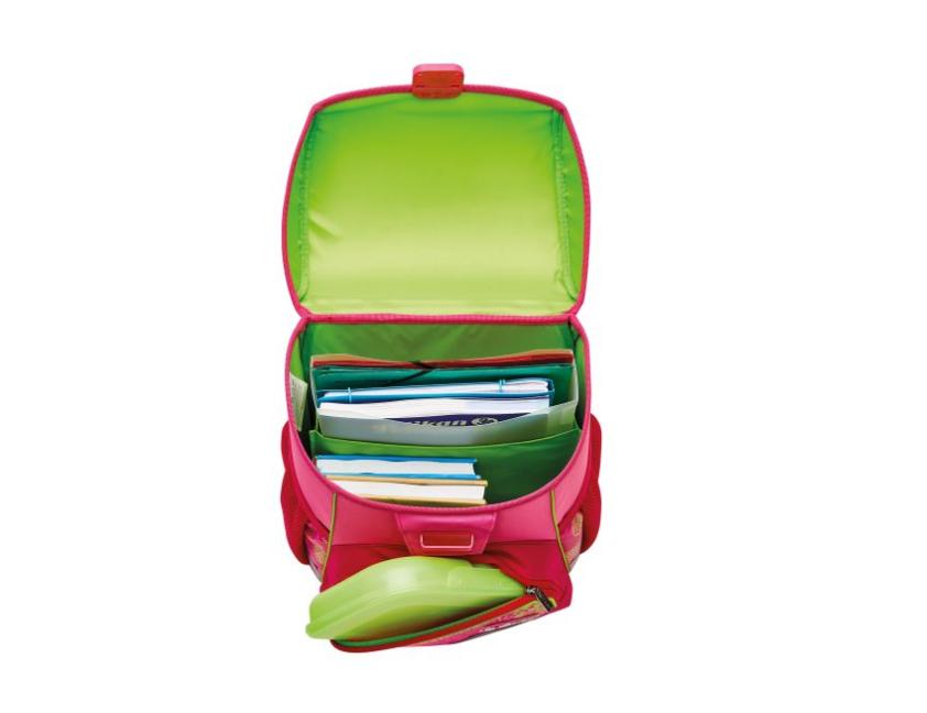 Раницата LOOP PLUS BLOOMY HORSE разполага с едно голямо основно с интегрирано отделение за книги, което може да бъде затворено с връзки, а под капака на раницата има място за учебната програма. Предният джоб има цип за аксесоари или кутия за храна и два странични с ластик - за бутилка с вода или чадър. Гърбът е дишащ и ергономичен, а презрамките са омекотени и регулируеми. Стабилното дъно на раницата е изработено от здрава пластмаса, която позволява на раницата да стои изправена, когато я поставите на земята и да не се замърсява.