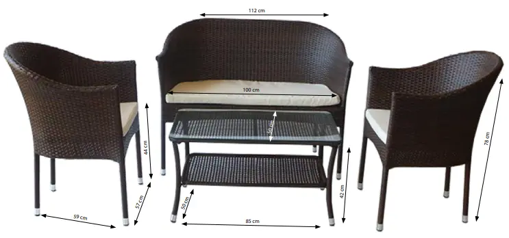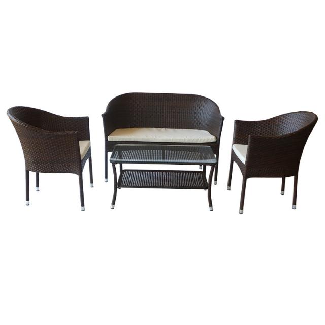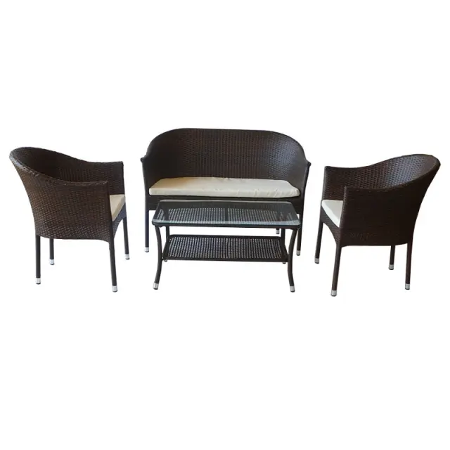 Ратанов комплект НЕСТИНАР включва масичка, двуместен диван и два фотьойла, които са с удобни възглавнички. Всички части в комплекта са изработени с метална рамка, оплетена със синтетичен ратан. Плотът на масата е с предпазно стъкло.