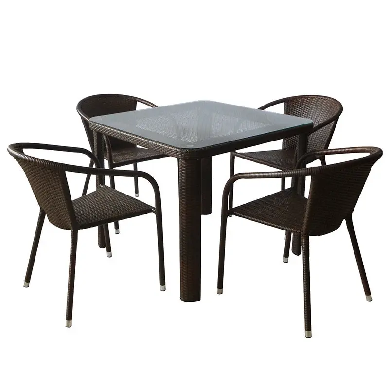Градински ратанов комплект РОСА е изработен с оплетка от синтетичен ратан, подходящ за любимия кът в градината. Комплектът включва маса със стъклен плот и четири стола с подлакътници.