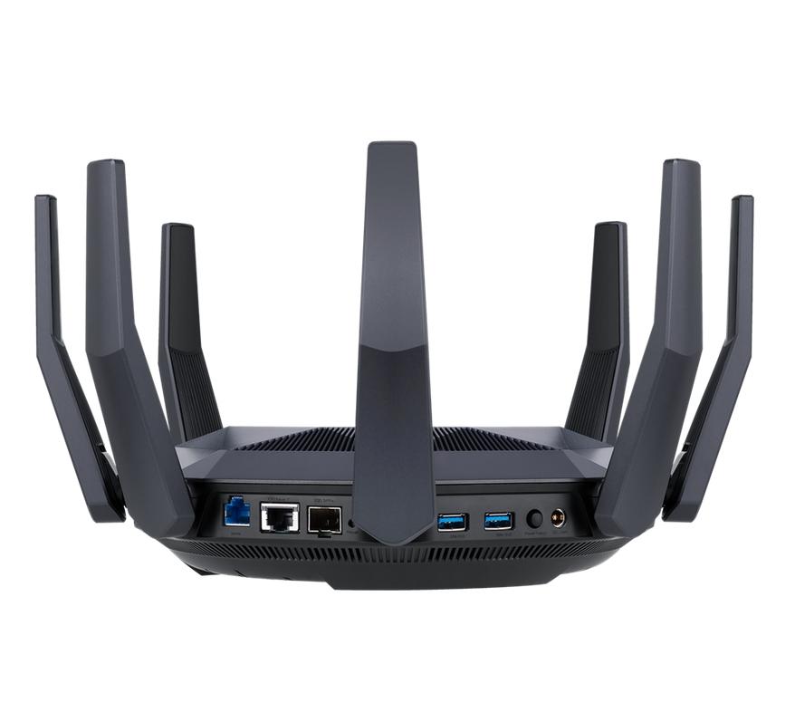 Рутер Asus Wireless Router, RT-AX89X, AX6000, 8x8 Dual-Band, Quad-Core 2.2GHz CPU, 256MB/1GB Flash/RAM, 10G port, SFP+ port, AiProtection Pro, Adaptive QoS, VPN server/client, IPTV, OFDMA, MU-MIMO, Beamforming, Link Aggregation, Port forwarding, AiMesh, B