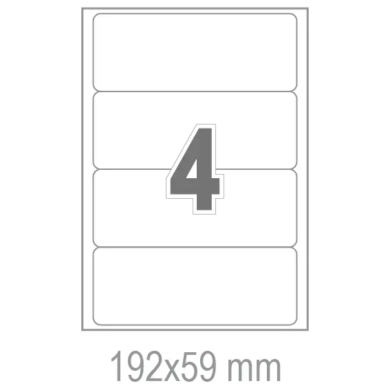 Самозалепващи етикети за класьори 192x59 4 бр. са практично и надеждно решение за организация в офиса, архива или склада. Всеки лист формат A4 съдържа 4 етикета с размер 192x59 мм. Идеални за класьори, папки, кутии и систематизиране на документация. Етикетите са изработени от висококачествена бяла хартия с устойчиво и силно лепило, което осигурява здраво и дълготрайно залепване върху различни повърхности. Подходящи са за печат с копирни машини, лазерни и мастилоструйни принтери, като гарантират ясно, прецизно и безразмазващо отпечатване на текст, баркодове, лога и графики.