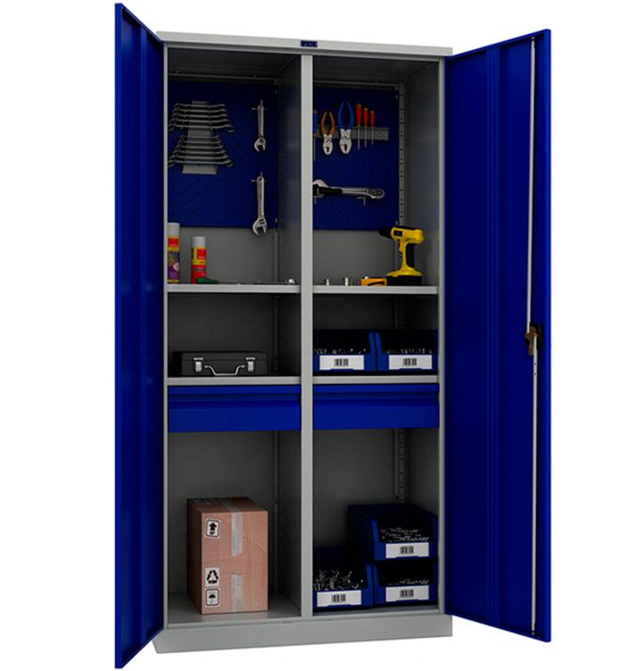 Шкафът PMT 1995 TC е предназначен за съхранениe на материали, консумативи и инструменти в производствени предприятия, автосервизи и ремонтни работилници. Включва две чекмеджета, четири рафта и два екрана за закачане на инстументи.