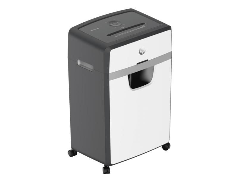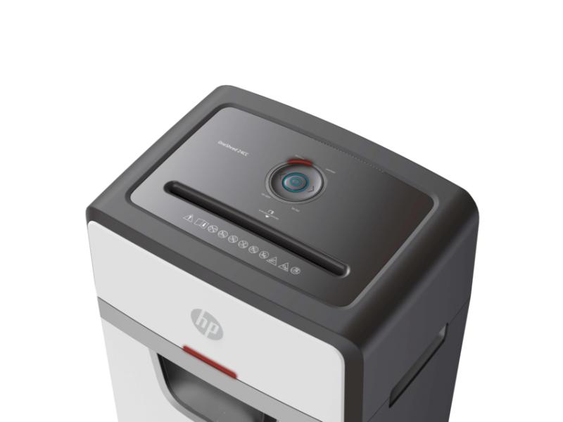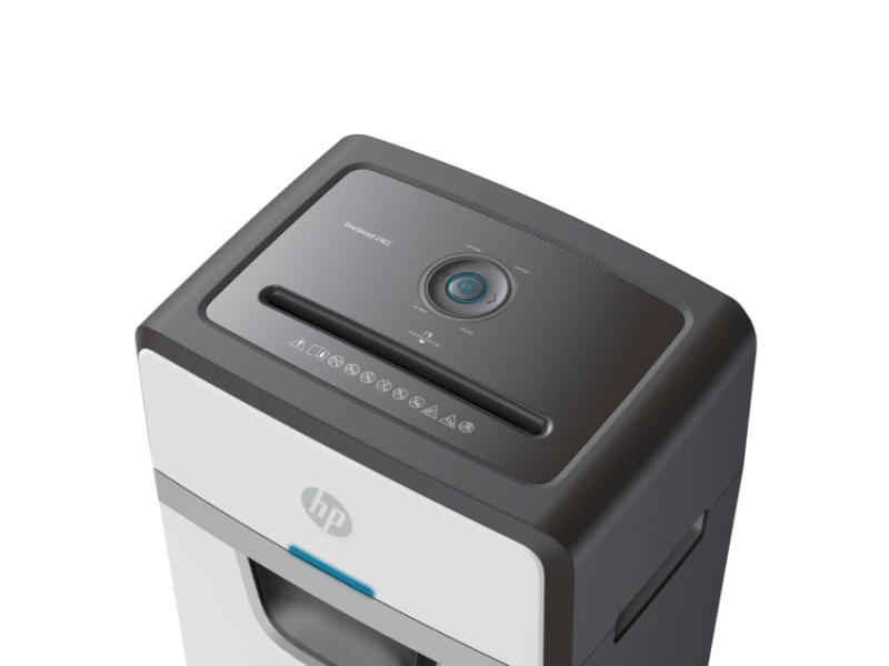 Шредерът HP OneShred 24CC е най-мощният шредер за документи с най-голям капацитет на унищожаване от тази серия. Този професионален шредер унищожава вашите чувствителни фирмени данни, като баланси или данъчни документи, напречно нарязани на малки изрезки с размери 4x35 мм и отговаря на ниво на сигурност P-4. След особено дълго време на работа от повече от 30 минути, професионалният шредер в черен дизайн изисква период на охлаждане, за да се избегне прегряване. Удобният шредер за документи със заключващи се колелца впечатлява с изключително тих работен шум от само 55 децибела и е подходящ за използване в офиси с отворен план.