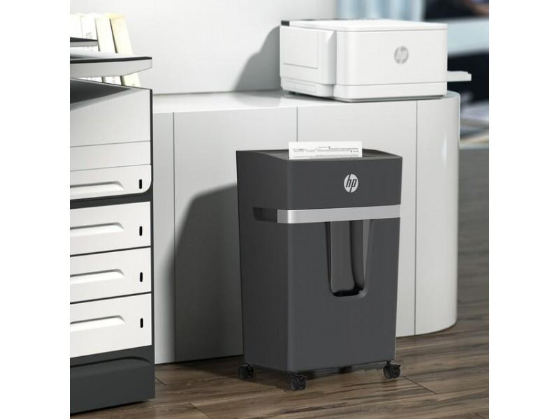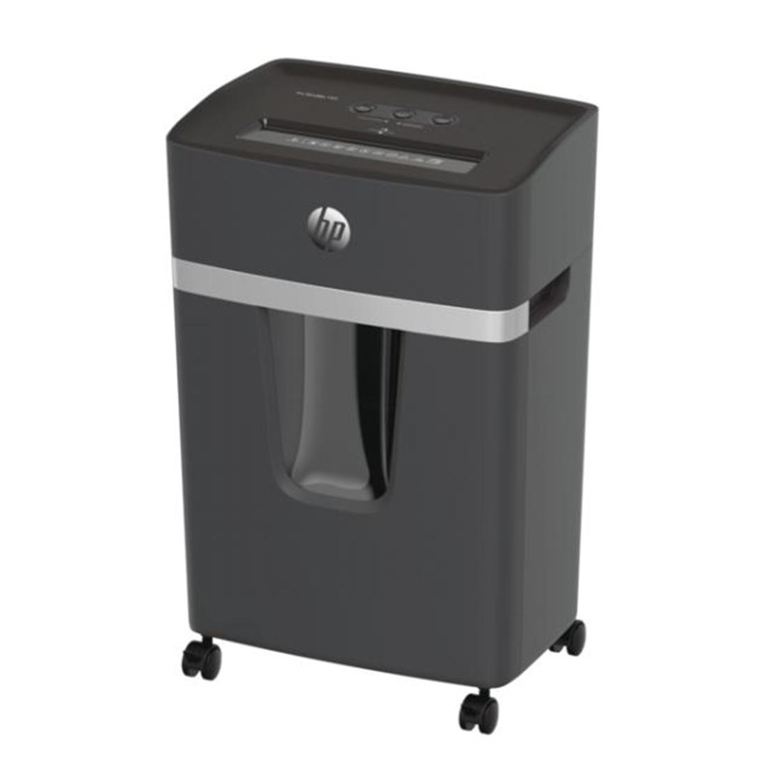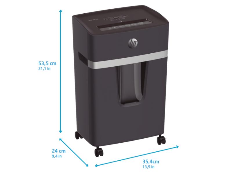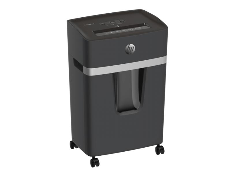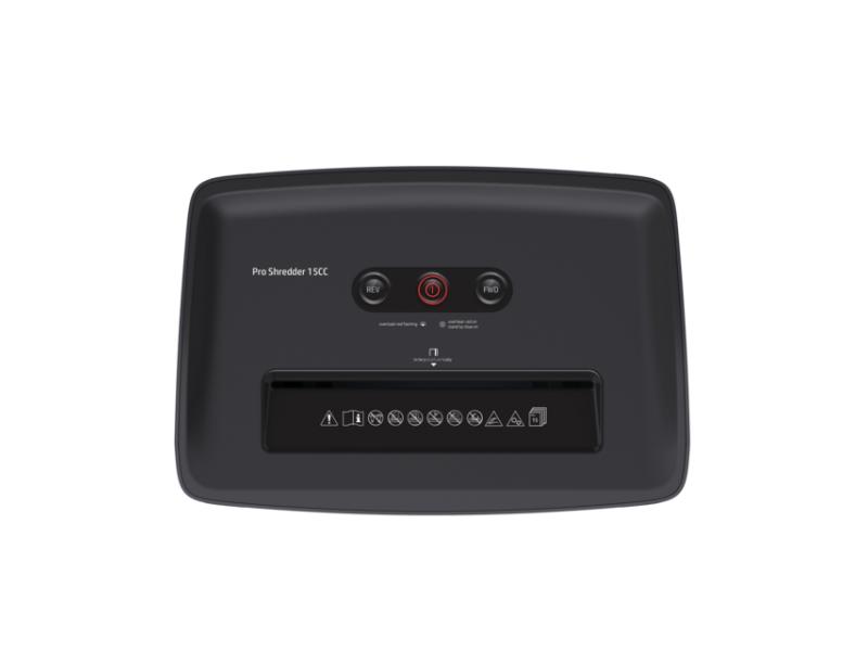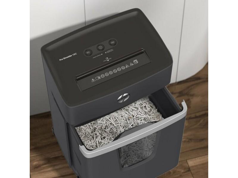 Елегантният HP Pro Shredder 15CC в черен дизайн пасва на всяко бюро и не трябва да липсва в нито един офис. С капацитет на унищожаване от 15 листа A4, шредерът на документи унищожава чувствителните ви фирмени данни напречно нарязани на изрезки с размери 4x35 мм и по този начин отговаря на високите изисквания за ниво на сигурност P-4. Това гарантира унищожаването на лични документи като трудови договори или ведомости за заплати в съответствие с директивата за защита на личните данн. Удобният шредер със заключващи се колелца печели точки в сравнение с подобно устройство от серията OneShred с особено тих работен шум от само 55 децибела и по-дълго време на работа от 20 минути.