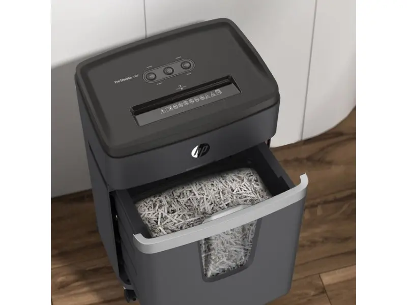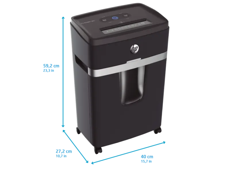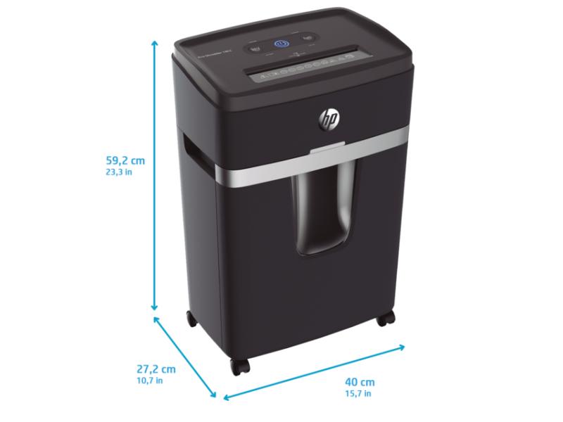 При напречно рязане, HP Pro Shredder 18CC надеждно унищожава вашите чувствителни фирмени данни с капацитет на рязане до 18 листа A4. С високо ниво на защита P-4, висококачественият шредер за документи раздробява вашите лични документи като фишове за заплати или трудови договори на изрезки с размери 4x35 мм в съответствие с GDPR. Mобилeн e благодарение на четирите си колелца. HP Pro Shredder 18CC впечатлява с изключително тих работен шум от само 55 децибела и дълго време на работа от 30 минути.