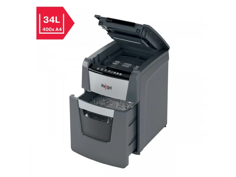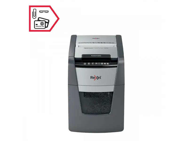 Този персонален шредер осигурява достатъчно сигурност при унищожаването на конфиденциални документи на малки парченца. Rexel Auto+ 100M е автоматичен шредер, което означава, че не се налага да стоите и да подавате хартия или да премахвате кламери и телбод. Разполага с 34 литров изваждащ се кош. Автоматично подаване до 100 листа хартия А4 (80гр) наведнъж, а ръчно машината може да унищожава до 6 листа.
