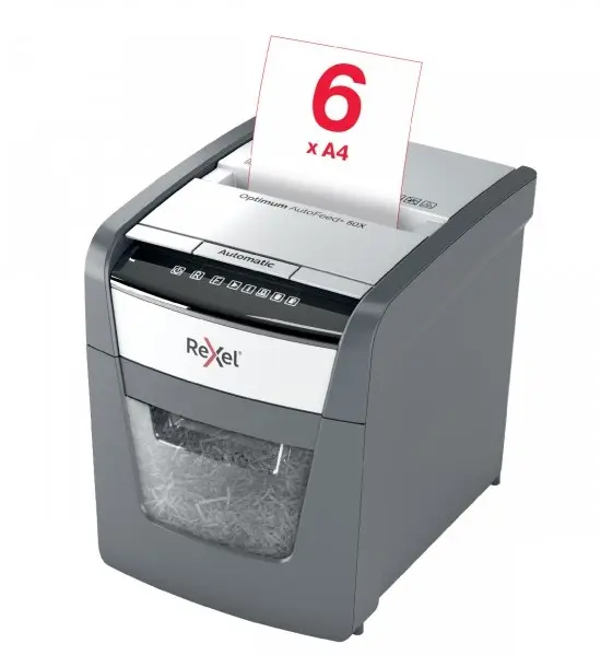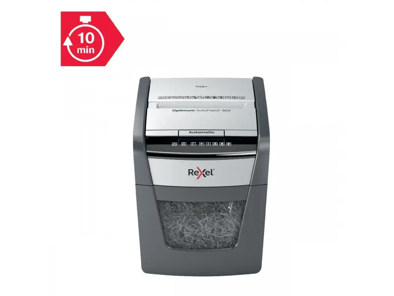 Шредерът Rexel Optimum Auto+ 50X може да унищожава до 50 листа наведнъж на парченца с размери 4x28мм. Този автоматичен шредер е идеален за употреба в дома или офиса, благодарение на компактния си кош от 20 литра. Не е необходимо предварително да премахвате телбод или кламери, машината прави това вместо вас.