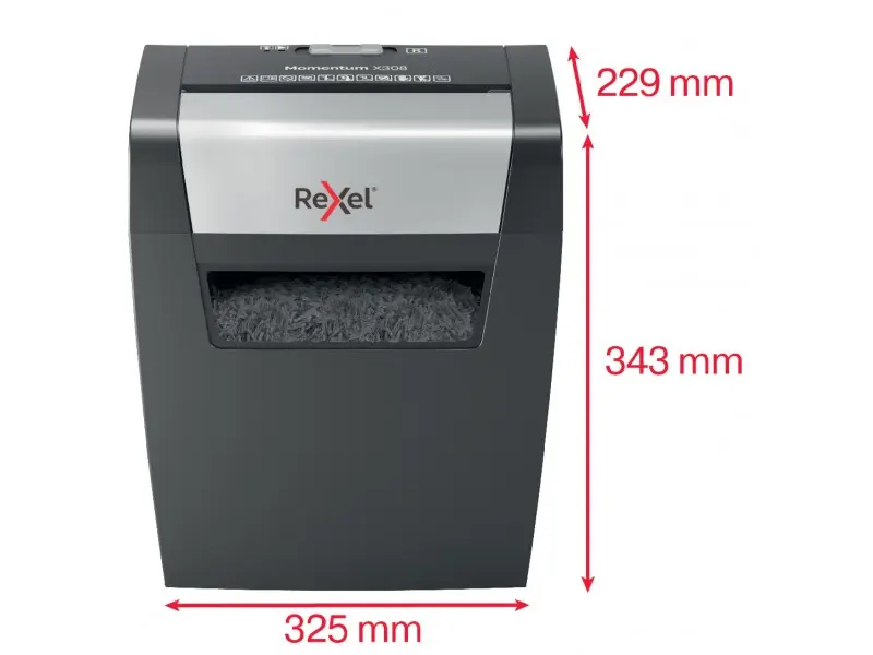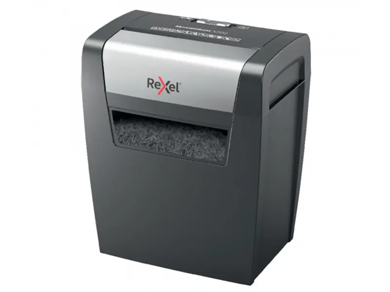 Rexel Momentum X308 e идеален шредер за домашна употреба.Той унищожава до 8 листа наведнъж и има 3 минути непрекъснато време на работа.Хартията се нарязва на 5x42 mm парченца, което дава на този шредер ниво на сигурност P-3. 15 литровият контейнер побира до 100 листа хартия А4 формат, а повдигащият се капак прави Momentum X308 лесен за изпразване.Шредерът унищожава документи с прикрепени към него кламери и телбод.