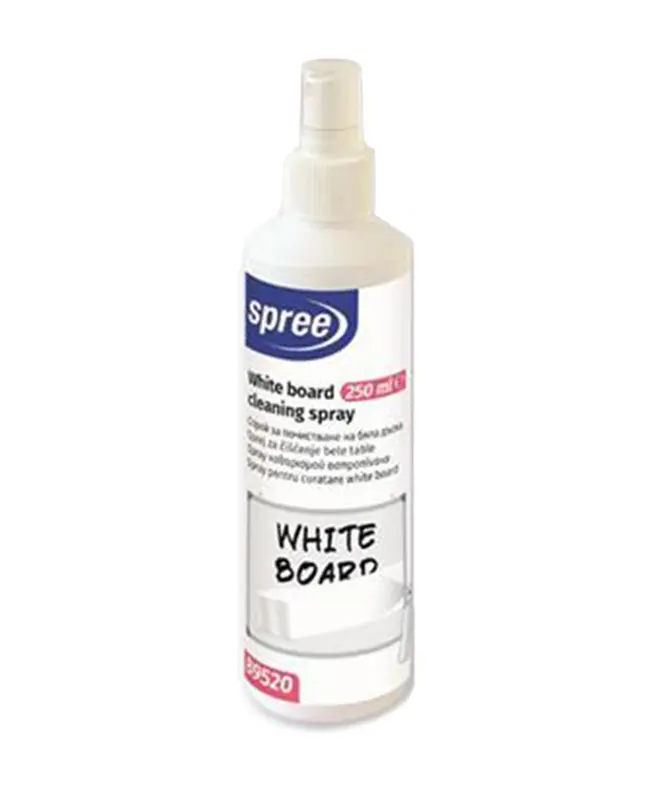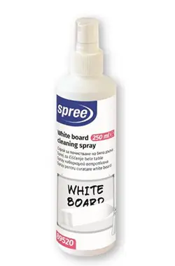Спреят за бяла дъска Spree 250 мл качествено и надеждно почиства всичко написано с маркери за бяла дъска без да оставя остатъци и да размазва мастилото.