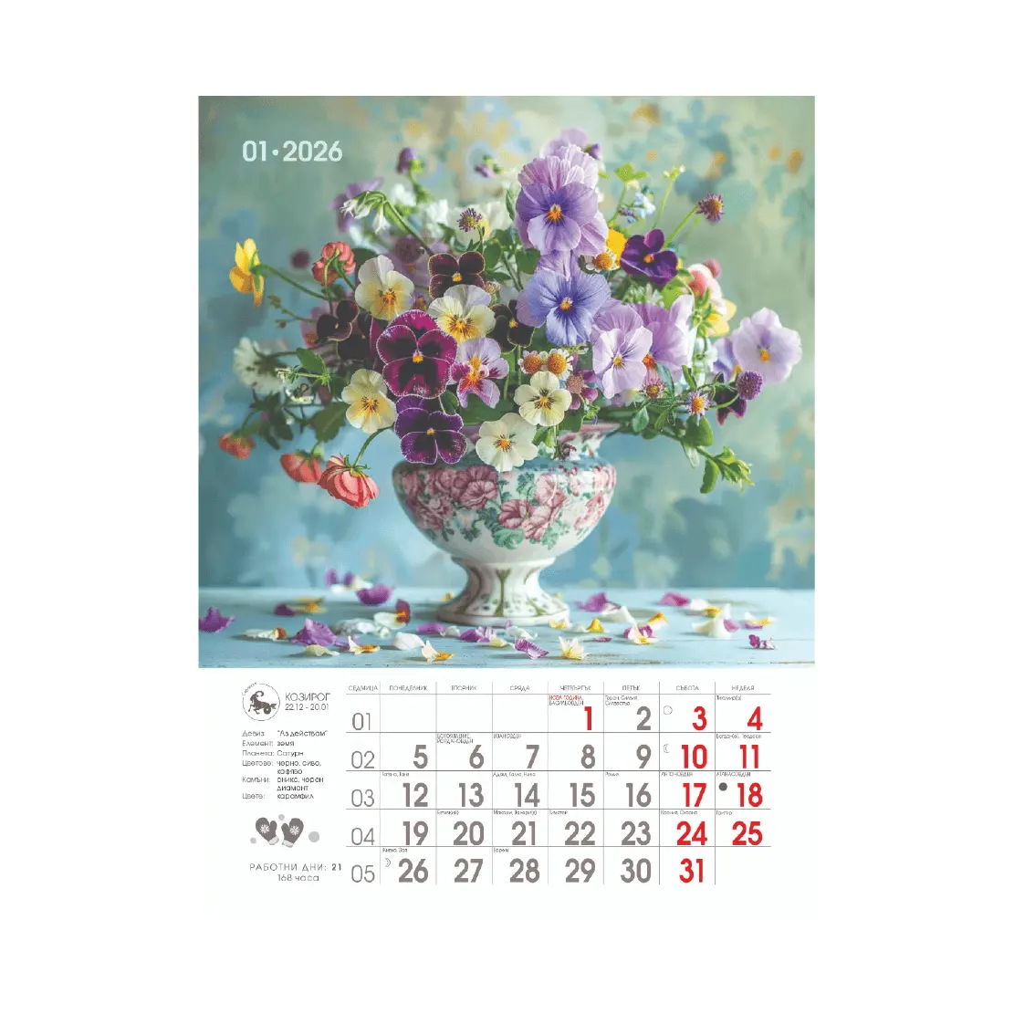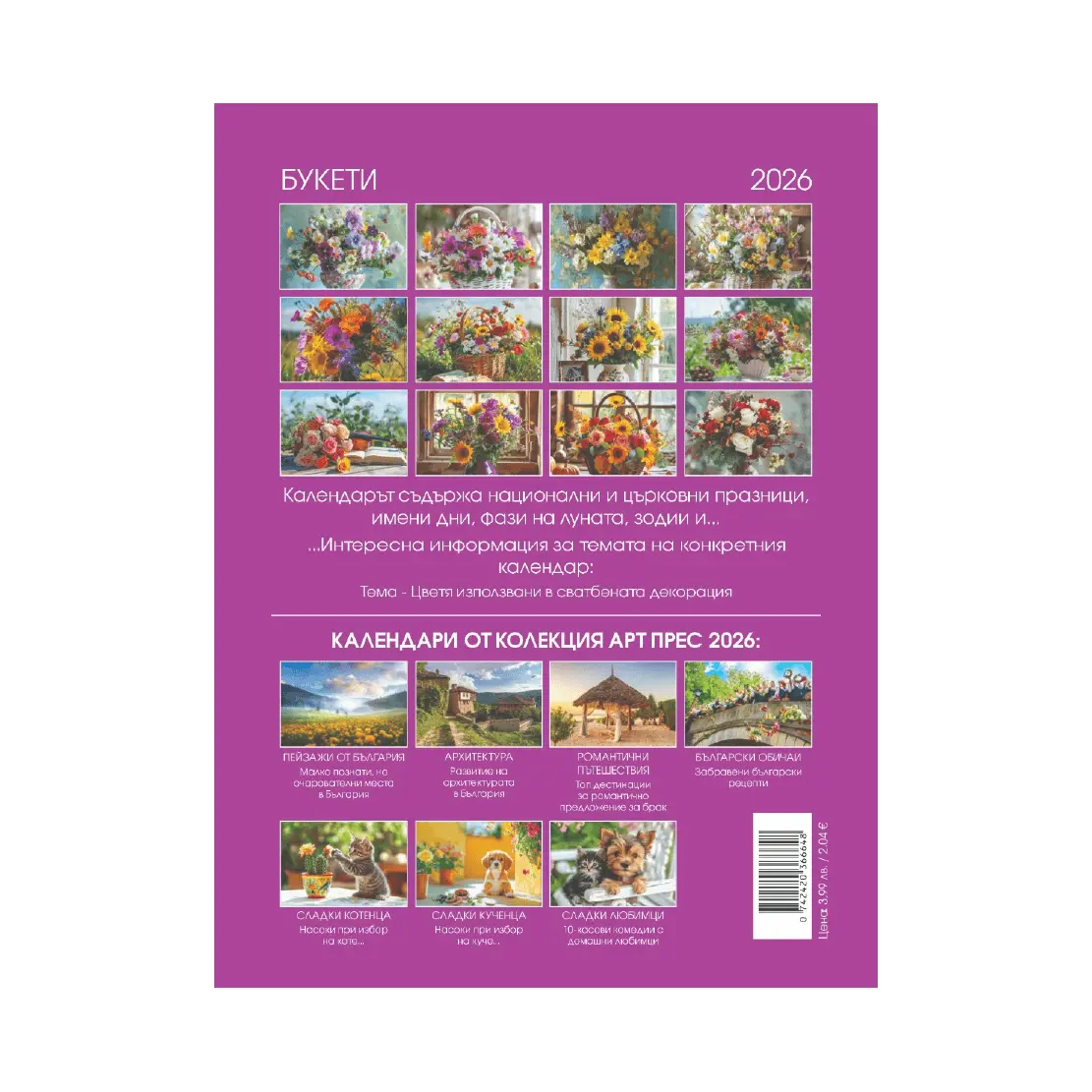 Стенен календар Букети с готов дизайн, изпълнен с цвят, свежест и елегантност. Всеки лист представя красиво заснети цветни букети, които внасят настроение, хармония и уют във всеки дом или офис. Този календар е чудесен избор за хора, които обичат природата, цветята и красивите детайли.