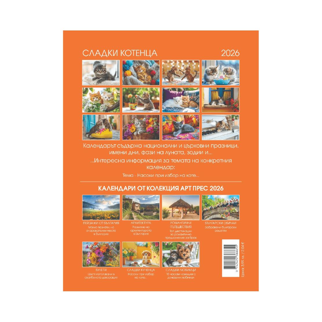 Стенен календар Котенца с готов дизайн, създаден за всички, които обичат котките и нежните моменти в ежедневието. Всеки лист показва очарователни снимки на игриви и сладки котенца, които внасят топлина, усмивки и уют през цялата година.