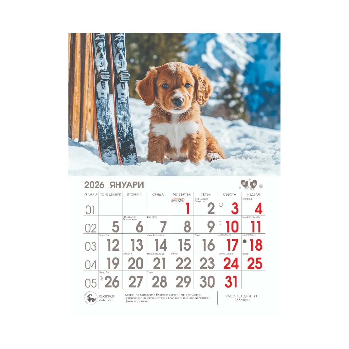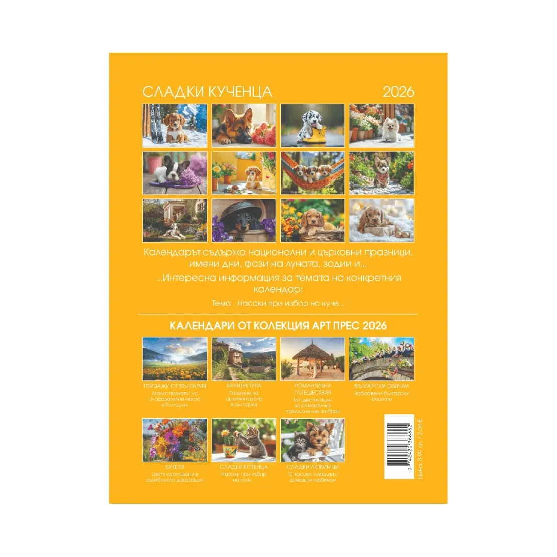 Стенен календар Кученца с готов дизайн, създаден за любителите на домашните любимци и специално на кучетата. Всеки лист представя сладки и игриви кученца, които внасят радост, усмивки и положителна енергия всеки ден от годината.