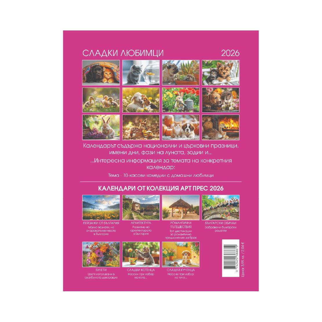 Стенен календар Любимци с готов дизайн, създаден за всички, които обичат домашните животни. Всеки лист представя очарователни снимки на кучета, котки и други любимци, които внасят радост, настроение и топлина във всеки ден от годината.