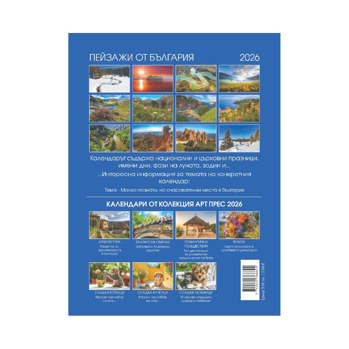 Стенен календар Пейзажи от България с готов дизайн, посветен на природната красота и културното богатство на родината. Всеки лист представя живописни снимки на планини, езера, морски брегове и исторически забележителности, които отразяват неповторимия дух на България.