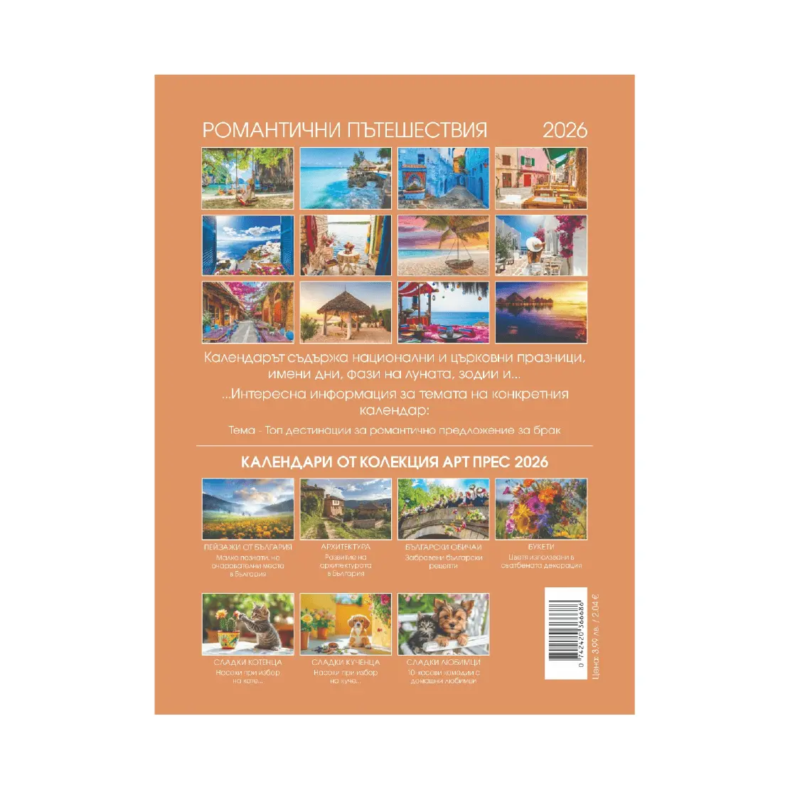 Стенен календар Романтика с готов дизайн, създаден за любителите на нежността и красивите моменти. Всеки лист представя романтични сцени, пейзажи и композиции, които вдъхват уют, вдъхновение и настроение през цялата година.
