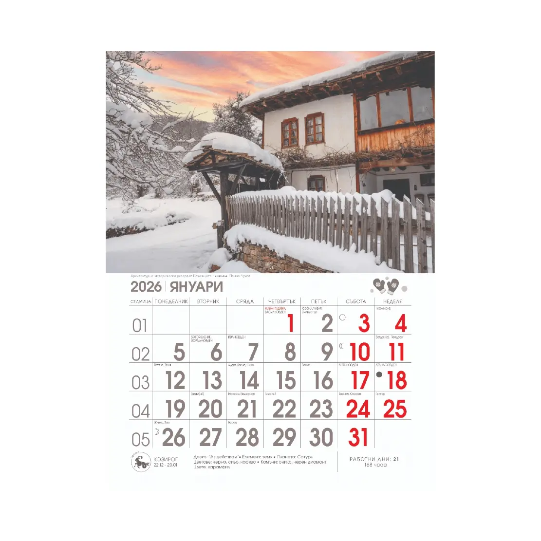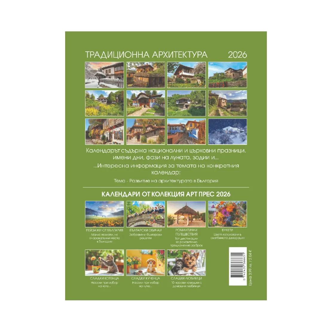 Стенен календар Традиционна архитектура с готов дизайн, посветен на богатото културно наследство и възрожденския дух на България. Всеки лист представя красиви снимки на старинни къщи, каменни улици и уникални архитектурни детайли, които носят усещане за история, уют и национална гордост.