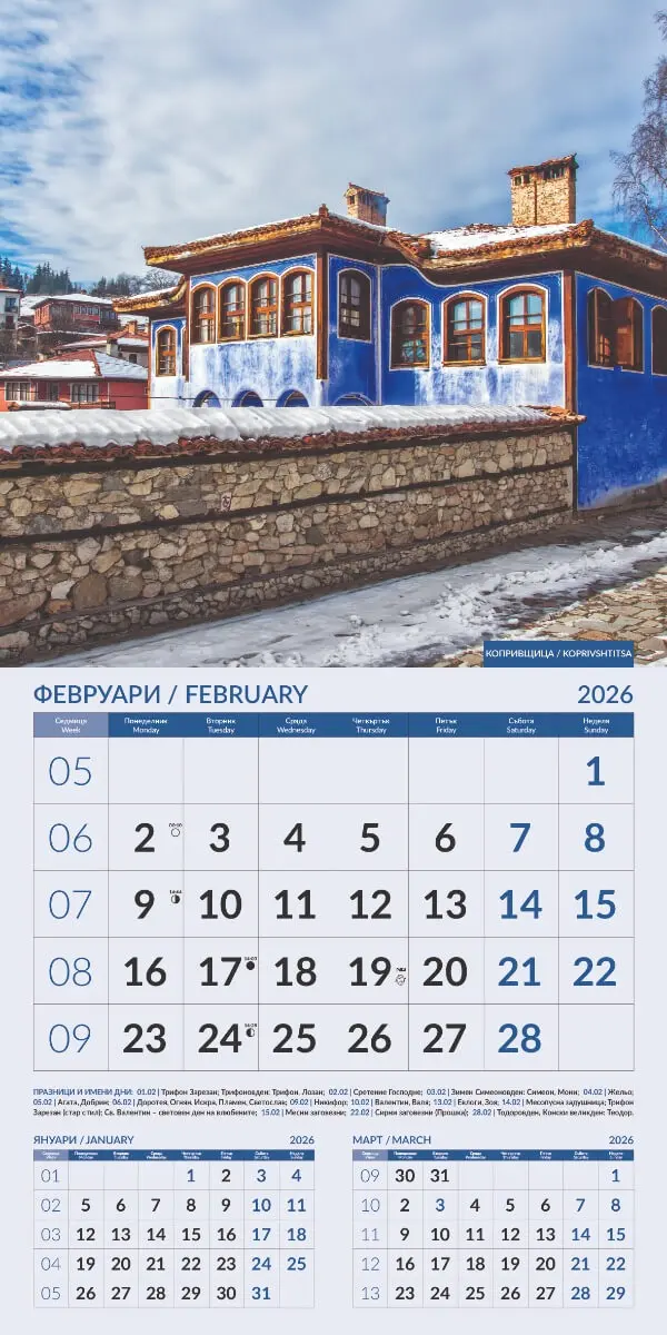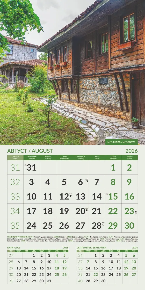 Стенен луксозен календар 12 листа Български къщи е с готов дизайн, който представя красиви пейзажи на традиционни български къщи. Идеален за дома, офиса или фирмени подаръци, календарът съчетава стил, функционалност и висококачествени материали.