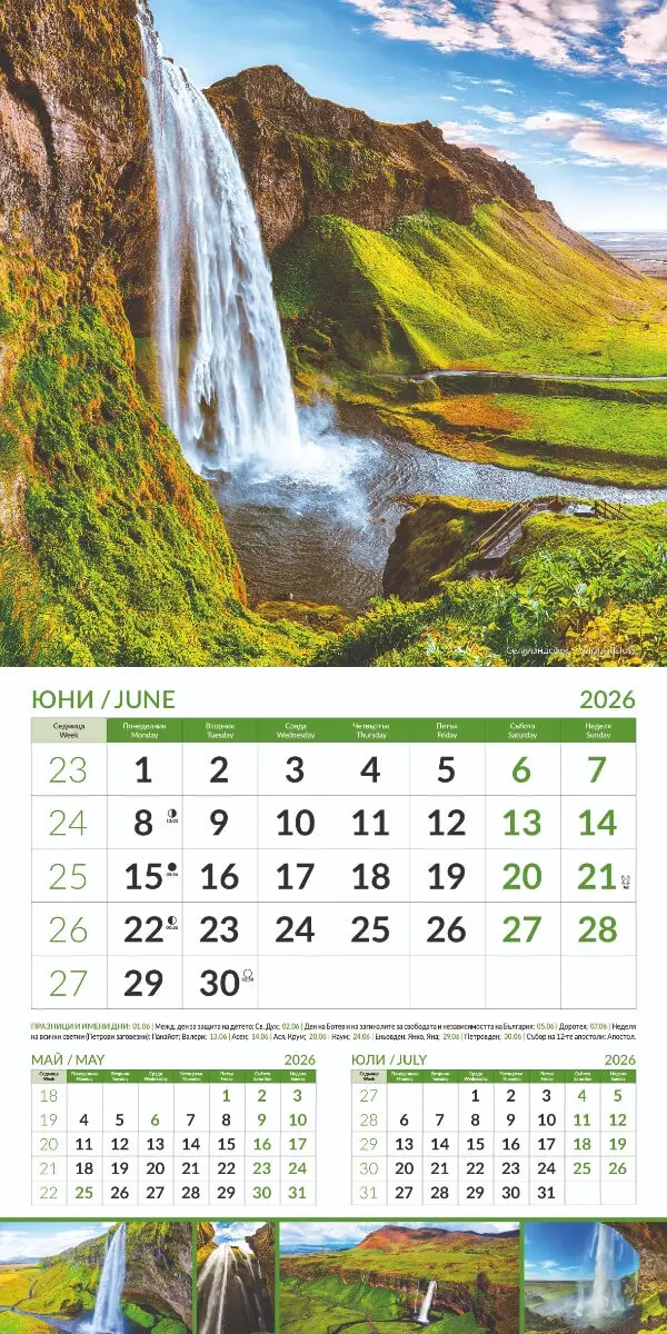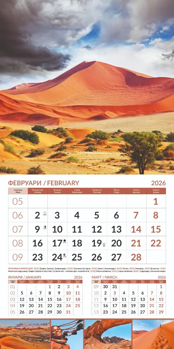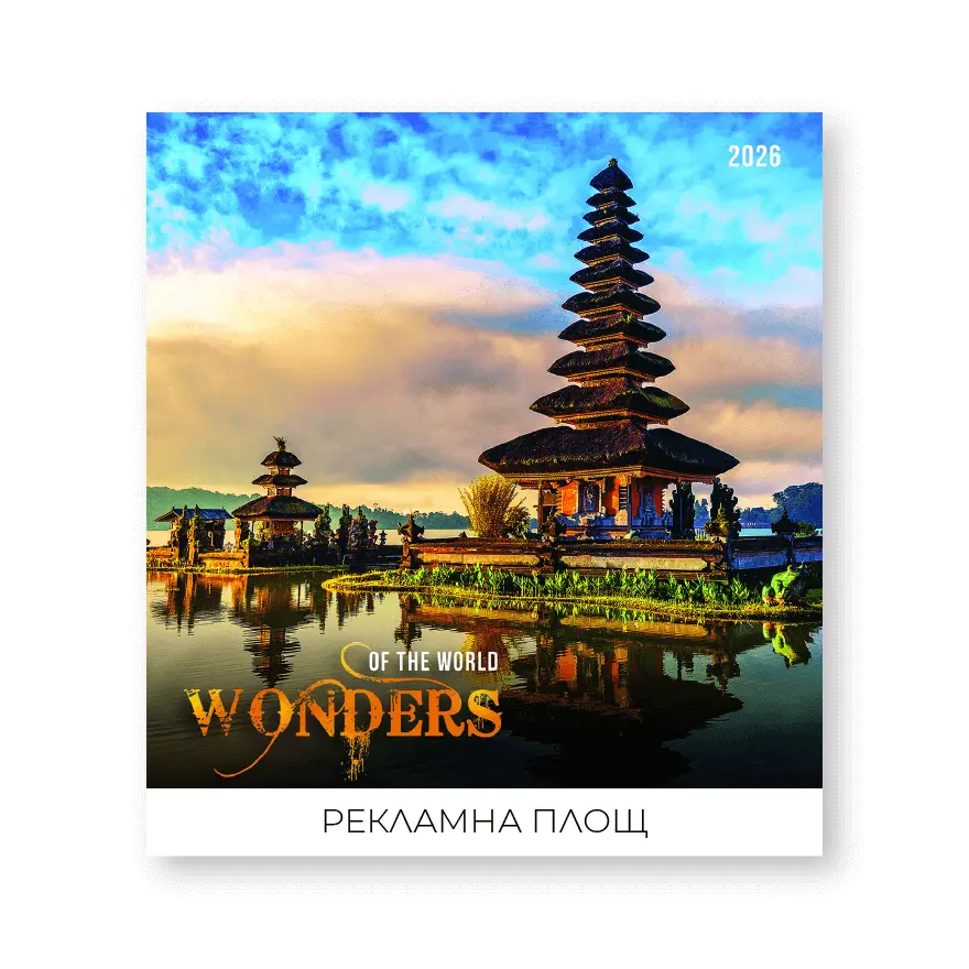 Стенен луксозен календар 12 листа Чудесата на света с готов дизайн. Всяка страница е вдъхновена от величествените архитектурни и природни забележителности на планетата, съчетана с изчистен двуезичен календариум на български и английски.