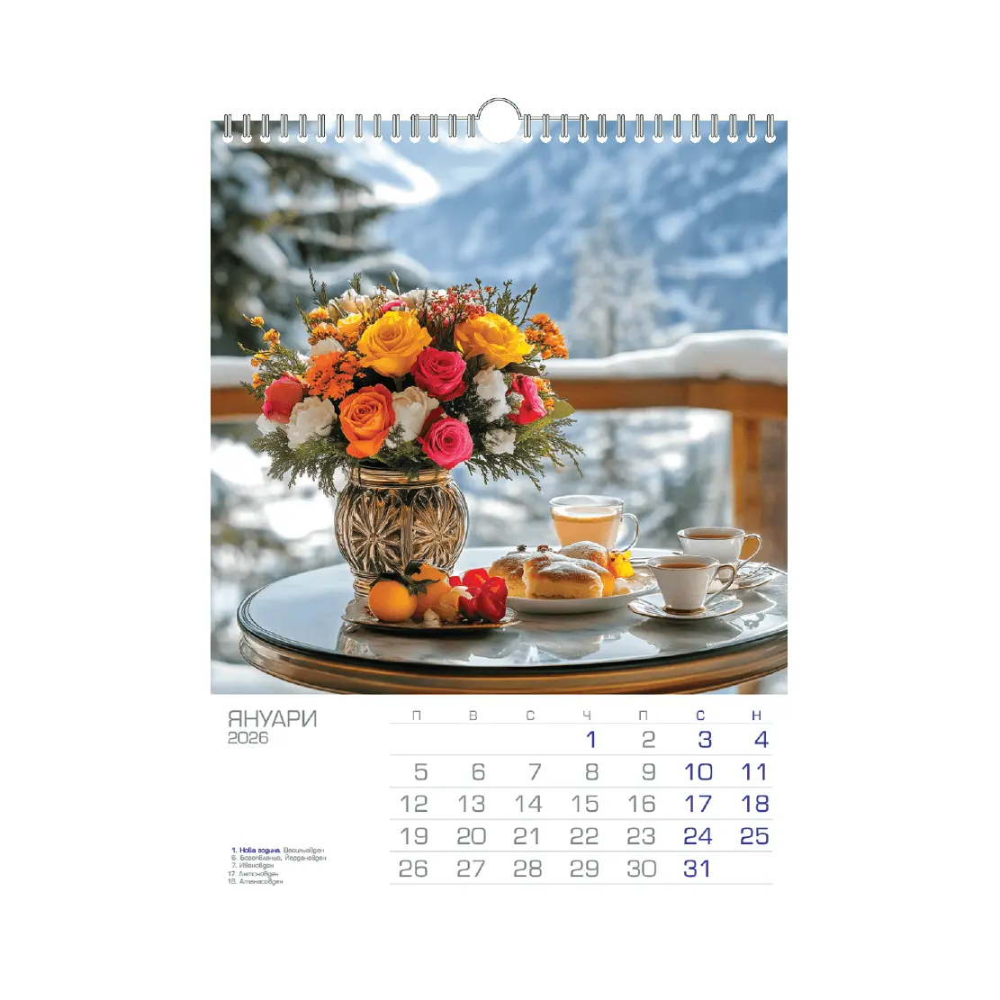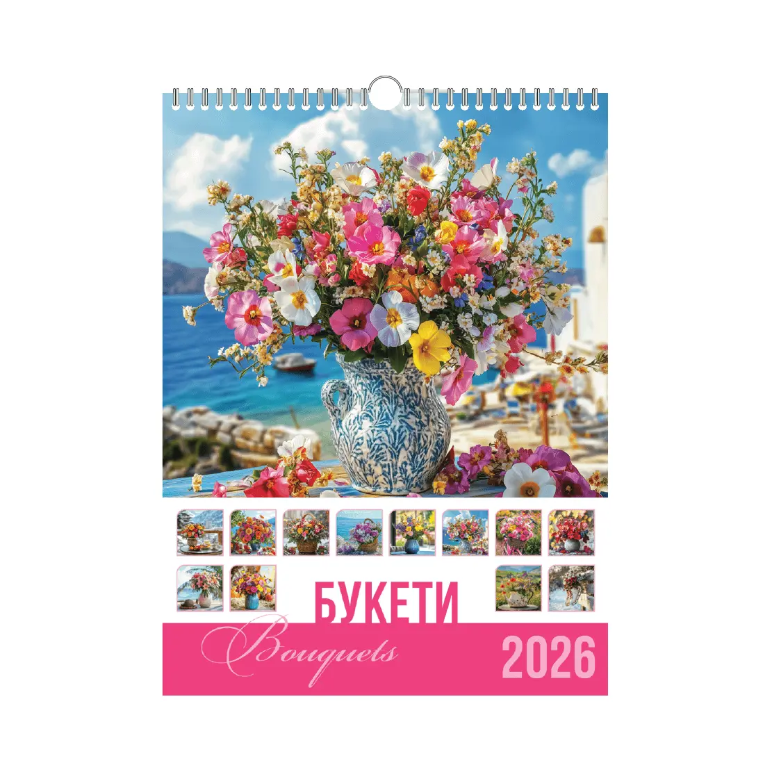 Стенен луксозен календар Букети с 13 листа е елегантен и практичен избор за дома, офиса или като подарък. Календарът съдържа календариум на два езика български и английски, което го прави удобен за различни потребители.
