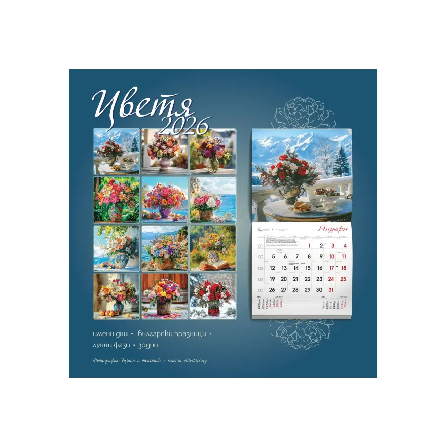Стенен луксозен календар К28 Цветя с 14 листа е елегантен и свеж акцент за всеки дом или офис. Всеки месец е представен с изящна снимка на цветя, създаваща усещане за хармония, красота и позитивно настроение през цялата година.