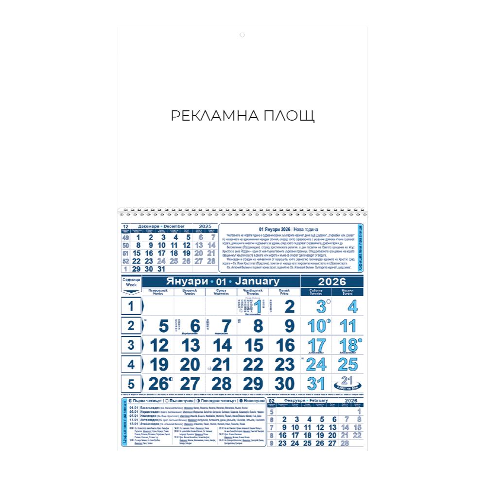 - Отбелязани официални празници, лунни фази, именни дни, зодии