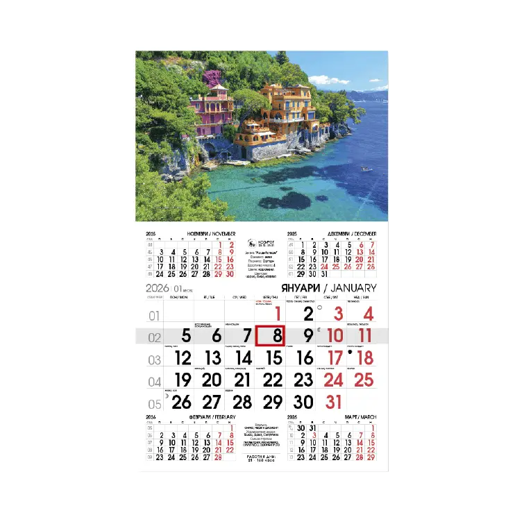 Работен календар РК 5 с готов дизайн е стилен и функционален календар, създаден за максимално удобство в офиса или у дома. Календарът разполага с календариум на два езика – български и английски, което го прави подходящ за международни компании и клиенти.