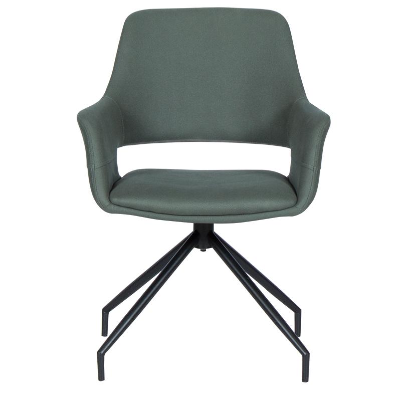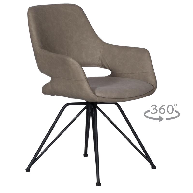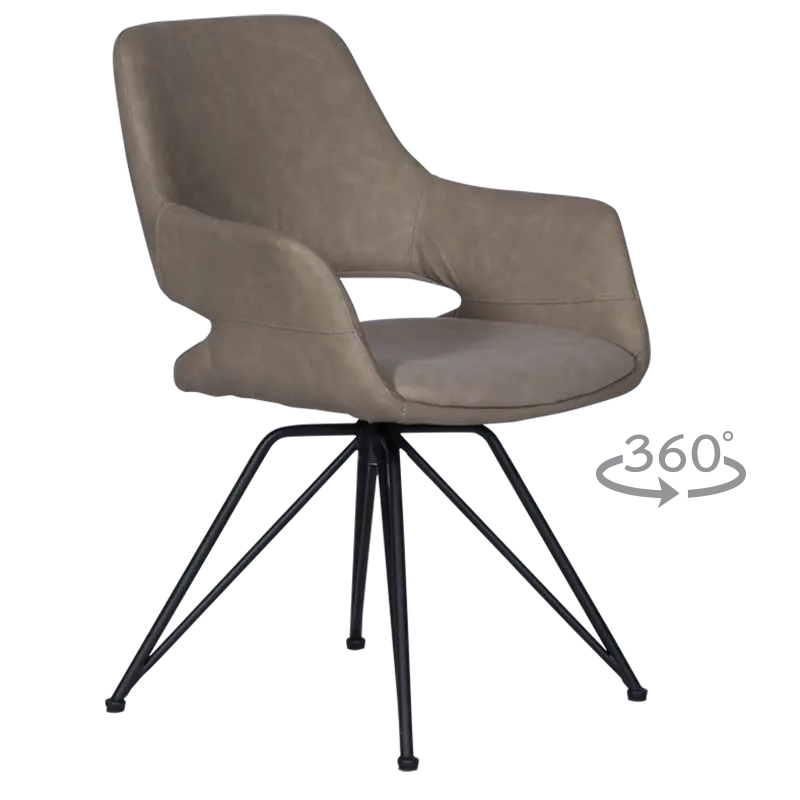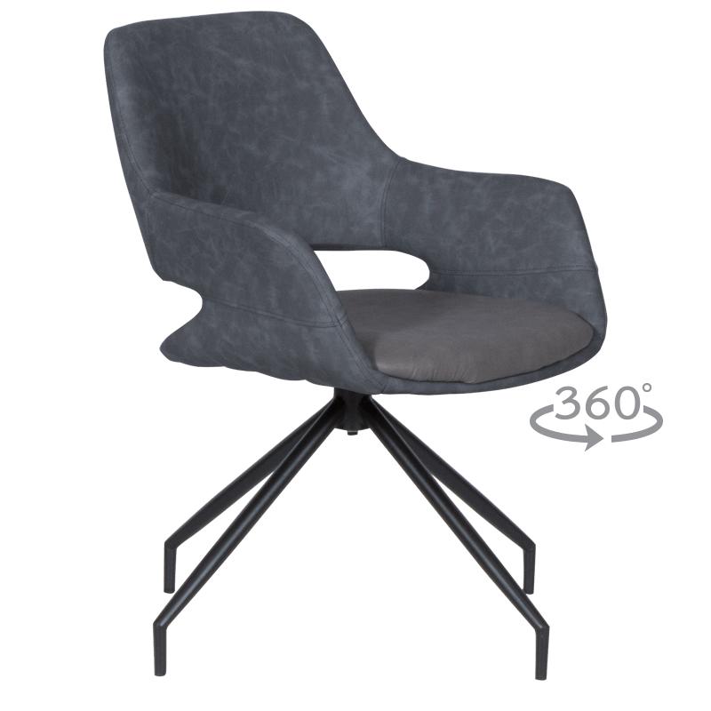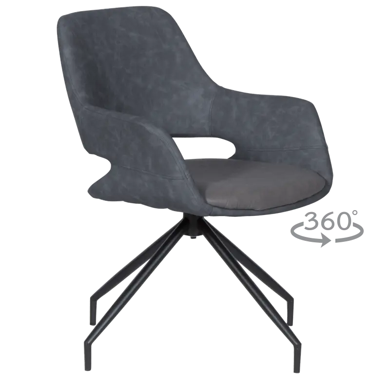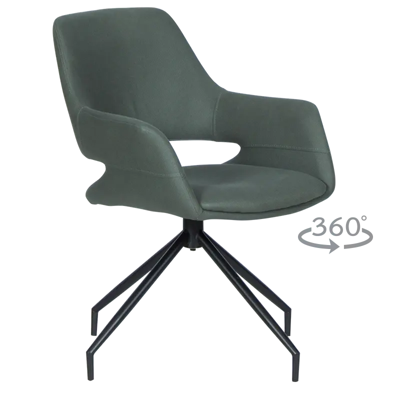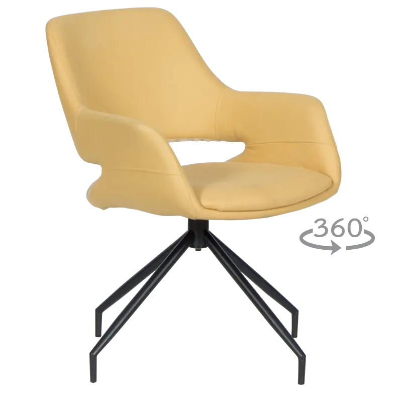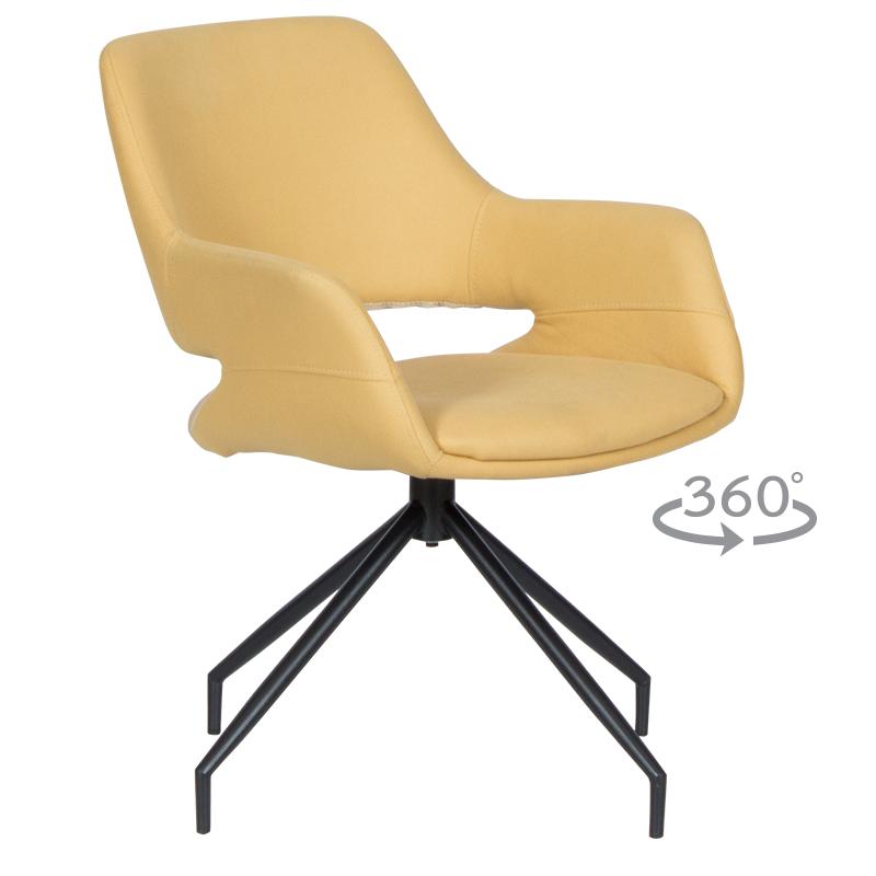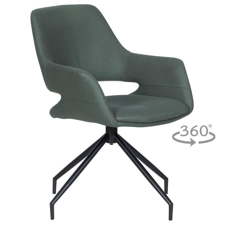 РАДЕЛИНА е трапезен стол с модерен дизайн, нестандартни крака и функция за въртене на седалката на 360°. Изработен е от висококачествена дамаска и праховобоядисан метал.