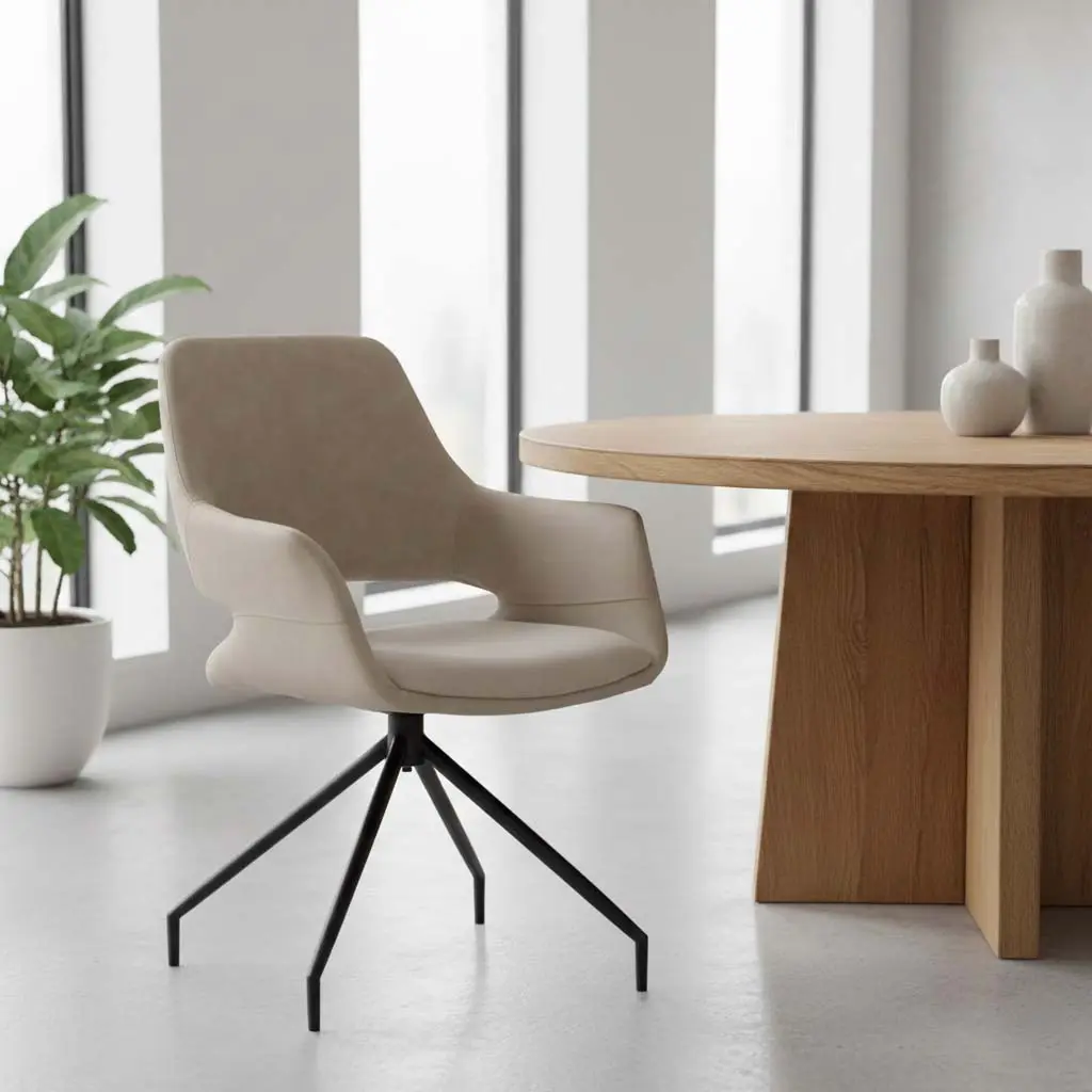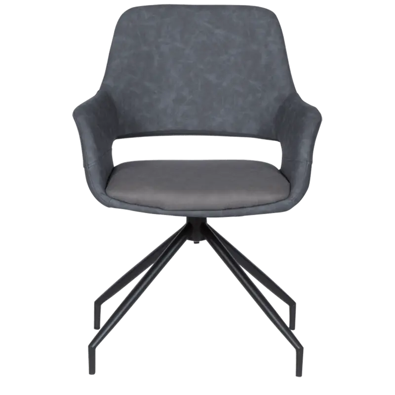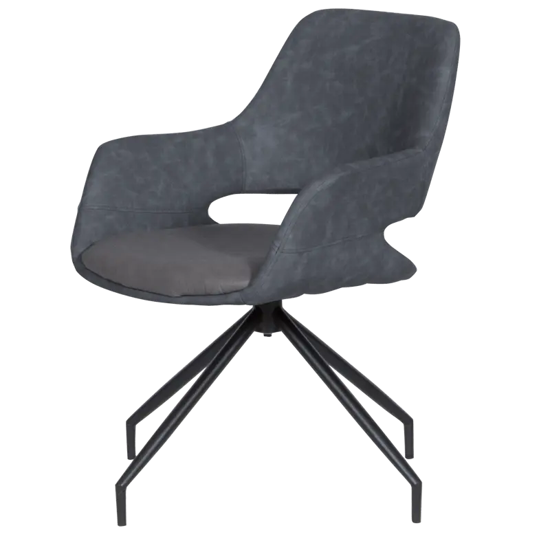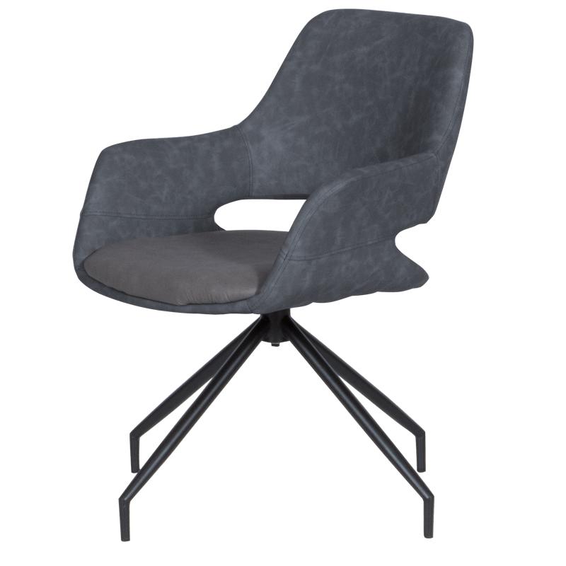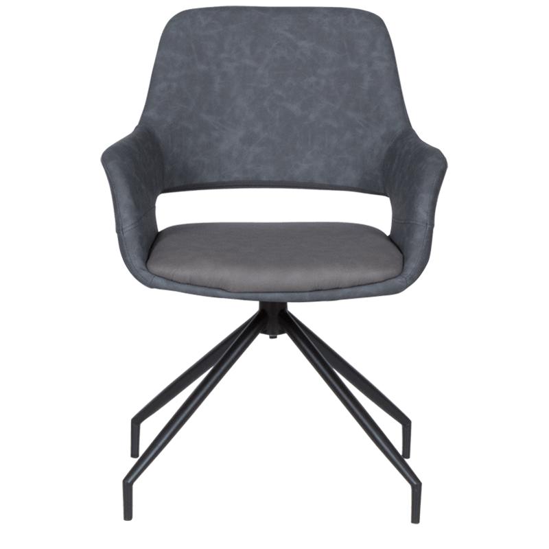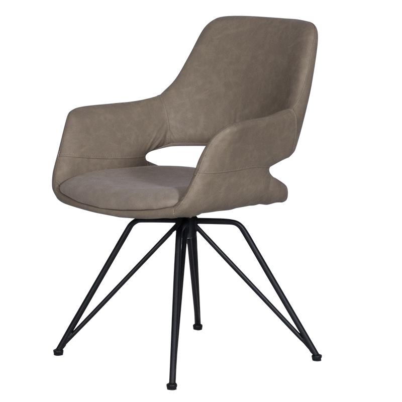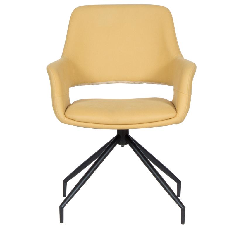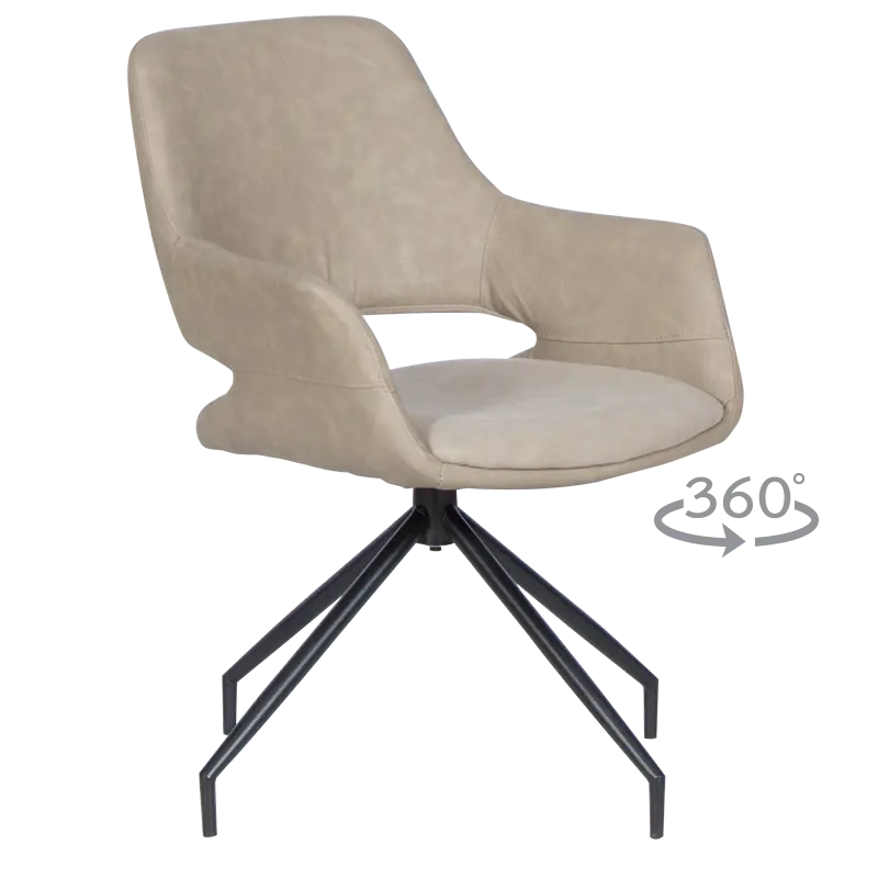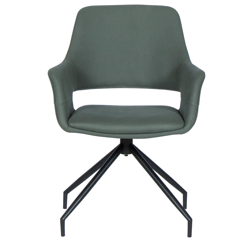 РАДЕЛИНА е трапезен стол с модерен дизайн, нестандартни крака и функция за въртене на седалката на 360°. Изработен е от висококачествена дамаска и праховобоядисан метал.