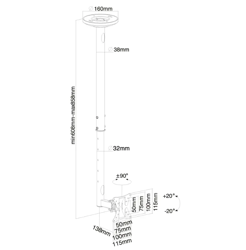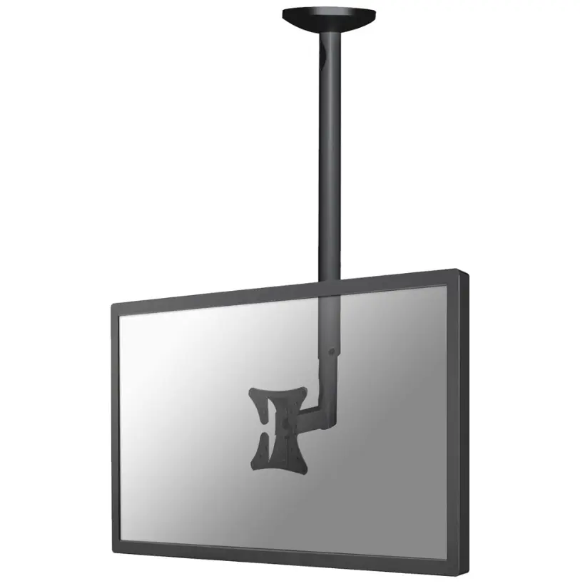 FPMA- C050 е накланяща се и въртяща се стойка за таван за плоски екрани с големина до 30 инча (76 сантиметра). Тази стойка е чудесен избор за спестяване на място, особено в случаите, когато монтажа на стена или на под не са добри опции. Гъвкавата технология за накланяне (40°) и завъртане (180°) позволява на стойката да се променя към всеки ъгъл на гледане, за да се възползвате напълно от възможностите на плоския екран. Ако желаете имате възможността да регулирате височината на стойката от 50 до 85 сантиметра. Освен това стойката разполага с иновативно управление на кабели, което скрива и насочва кабелите от стойката към плоския екран. По този начин вашите кабели ще бъдат скрити и ще може да поддържате работното си място хубаво и подредено. FPMA-C050 има две точки на въртене и е подходяща за екрани с големина до 30 инча. Максималният капацитет за тегло на тази стойка е 20 кг. Стойката е подходяща за екрани, които отговарят на VESA шаблон с отвори 50х50 или 100x100 мм. Различните модели на дупки могат да бъдат покрити с помощта на адаптерни плочи Neomounts by Newstar VESA. Всички монтажни материали са включени в продукта.
