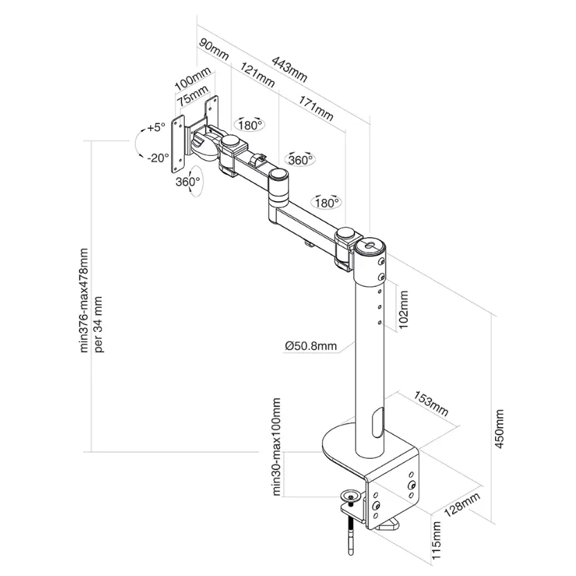 FPMA- D960BLACKPLUS е накланяща се и въртяща се стойка за бюро за плоски екрани с големина до 49 инча (124 см). Тази стойка е чудесен избор за спестяване на място на бюра, тъй като работи с помощта на скоба за бюро. Гъвкавата технология на накланяне (25°) и на завъртане (180°) позволява на стойката да се променя към всеки ъгъл на гледане, за да се възползвате напълно от възможностите на плоския екран. Ако желаете имате възможността да регулирате височината на стойката ръчно от 37 до 48 сантиметра. Освен това може да регулирате и дълбочината й – от 7 до 44 сантиметра. В допълнение стойката разполага с иновативно управление на кабели, което скрива и насочва кабелите от стойката към плоския екран. По този начин вашите кабели ще бъдат скрити и ще може да поддържате работното си място хубаво и подредено. FPMA- D960BLACKPLUS има три точки на въртене и е подходяща за екрани до 49 инча. Максималният капацитет за тегло на този продукт е 20 кг за всеки екран. Стойката за бюро е подходяща за екрани, които отговарят на VESA шаблон с отвори 75x75 или 100x100 мм. Различните модели на дупки могат да бъдат покрити с помощта на адаптерни плочи Neomounts by Newstar VESA. Употребата на тази ергономична стойка може да ви помогне да избегнете оплакванията от болки и неудобство във врата и гърба ви. Тази стойка е идеална за употреба в офиси и на гишета или в приемни. Всички монтажни материали са включени в продукта.