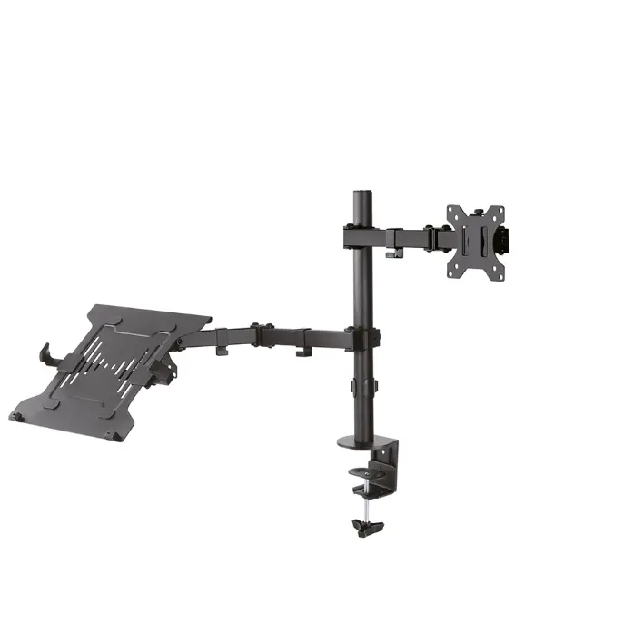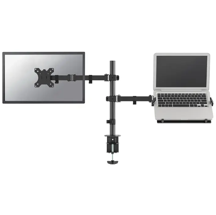 FPMA-D550NOTEBOOK е накланяща се и въртяща се стойка за бюро за ноутбуци до 15,6 инча и плоски екрани до 32 инча. Тази стойка е чудесен избор за спестяване на място на бюра, тъй като работи с помощта на скоба за бюро. Гъвкавата технология за накланяне ((+45°/-45°) и завъртане (180°) позволява на стойката да се променя към всеки ъгъл на гледане, за да се възползвате напълно от възможностите на плоския екран. Освен това може да регулирате височината (0-44 см) и дълбочината (4-52 см) на стойката, така че да работите по възможно най-удобния за вас начин. Освен това стойката разполага с иновативно управление на кабели, което скрива и насочва кабелите от стойката към плоския екран. По този начин вашите кабели ще бъдат скрити и ще може да поддържате работното си място хубаво и подредено. Тази стойка има три точки на въртене и е подходяща за екрани до 32 инча и за лаптопи до 15.6 инча. Максималният капацитет за тегло на плоския екран е 8 кг и 4,5 кг за лаптопа. Стойката за бюро е подходяща за екрани, които отговарят на VESA шаблон с отвори 75x75 или 100x100 мм. Различните модели на дупки могат да бъдат покрити с помощта на адаптерни плочи Neomounts by Newstar VESA. Употребата на тази ергономична стойка може да ви помогне да избегнете оплакванията от болки и неудобство във врата и гърба ви. Тази стойка е идеална за употреба в офиси и на гишета или в приемни. Всички монтажни материали са включени в продукта.