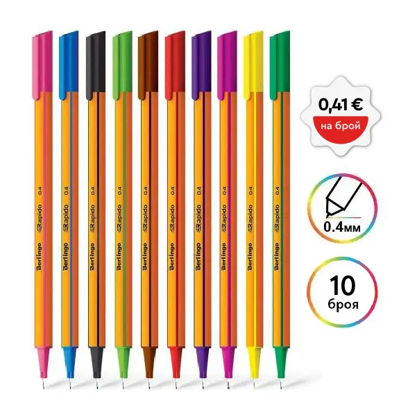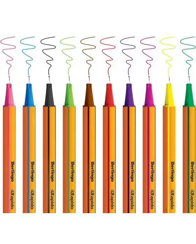 Комплект тънкописци Berlingo Rapido 0.4 мм 10 цвята са висококачествен фин лайнер, създаден за леко, меко и изключително прецизно писане. Идеален за рисуване, скициране, чертане и работа с детайли както в училище, така и в офиса. Ергономичният триъгълен корпус осигурява удобен захват и комфорт дори при продължителна употреба. Металният връх позволява работа с линийки и шаблони без риск от повреждане или разливане на мастилото.