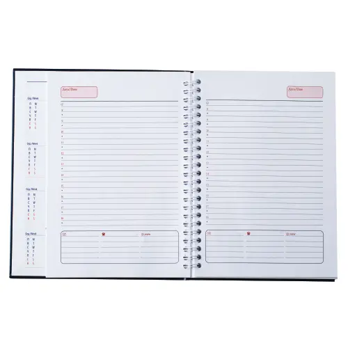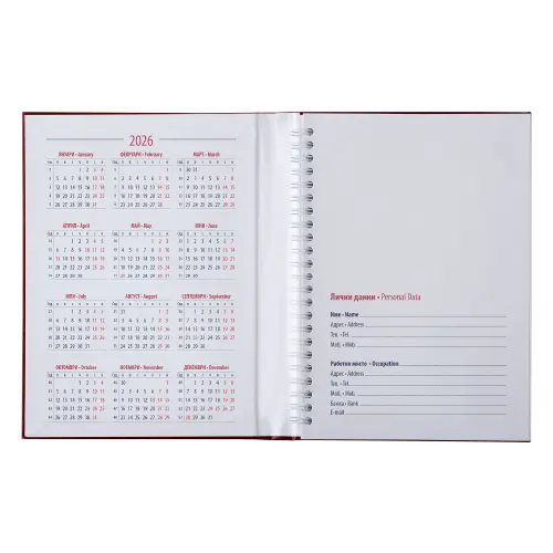 Календар бележник ДАКОТА е с размер А5, твърда корица и скрита спирала.