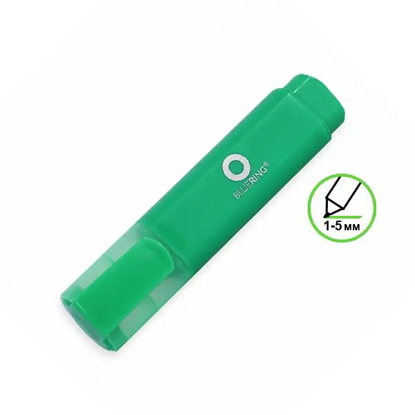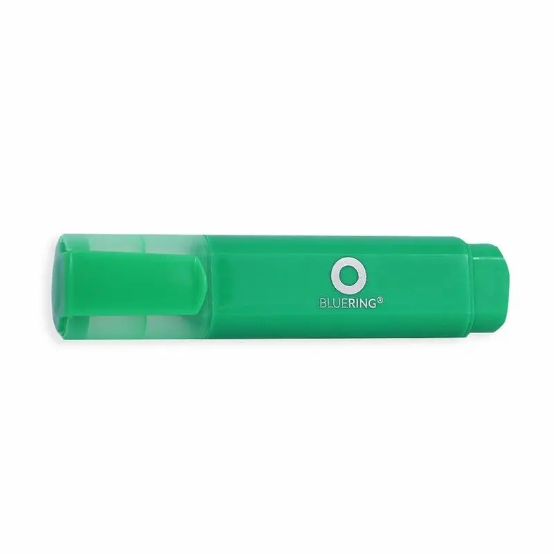 Текст маркер Bluering зелен цвят със скосен връх, който ще ви даде възможност за маркиране с 3 различни размера. С него ще можете да подчертавете с тънки линии 1 мм, по-плътни линии 2 мм, както и да маркирате текста с цялата дължина на писеца, която е 5 мм. Мастилото на текст маркерите Bluering е на водна основа, невидима при копиране и изпращане по факс.